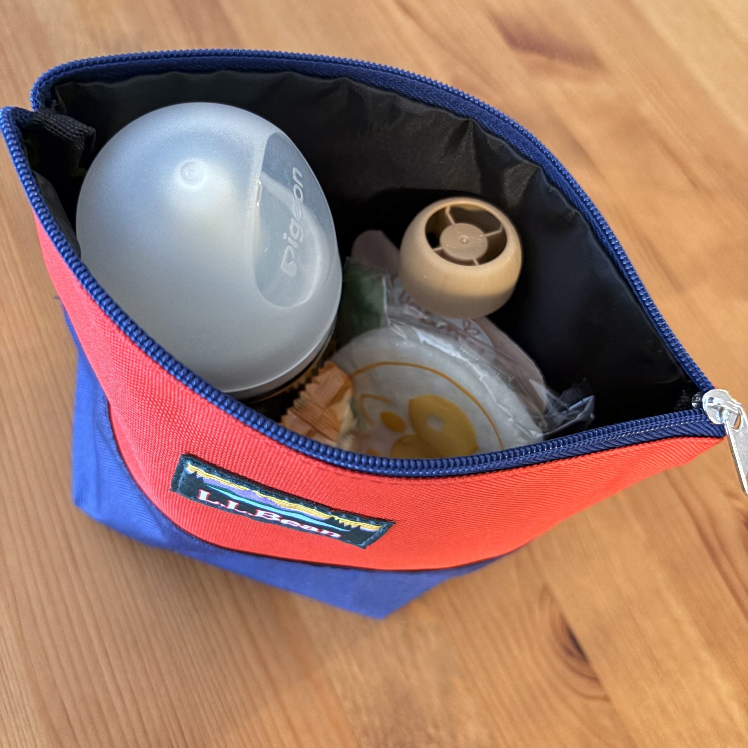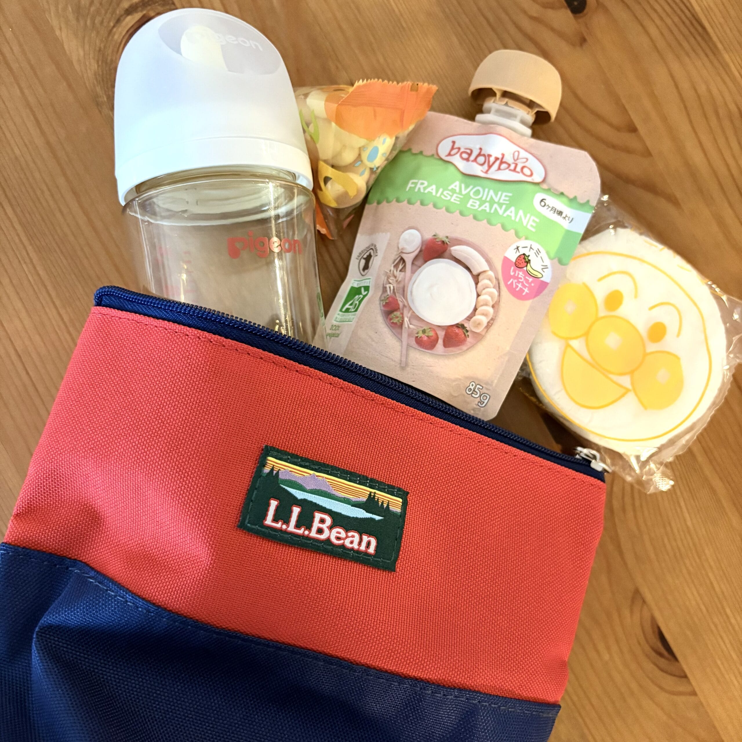私の現在のおでかけ必須アイテム、娘の哺乳瓶やおやつを入れてみたところ形状的にもフィット♡マチ付きの舟形が哺乳瓶入れにもぴったり。(念のためですが、ピジョンの大きい方の哺乳瓶の場合、ファスナーを閉めるとポーチの中で少し斜めになります。)おせんべいやボーロなど、つぶれてほしくないおやつもきちんと持ち運べます。