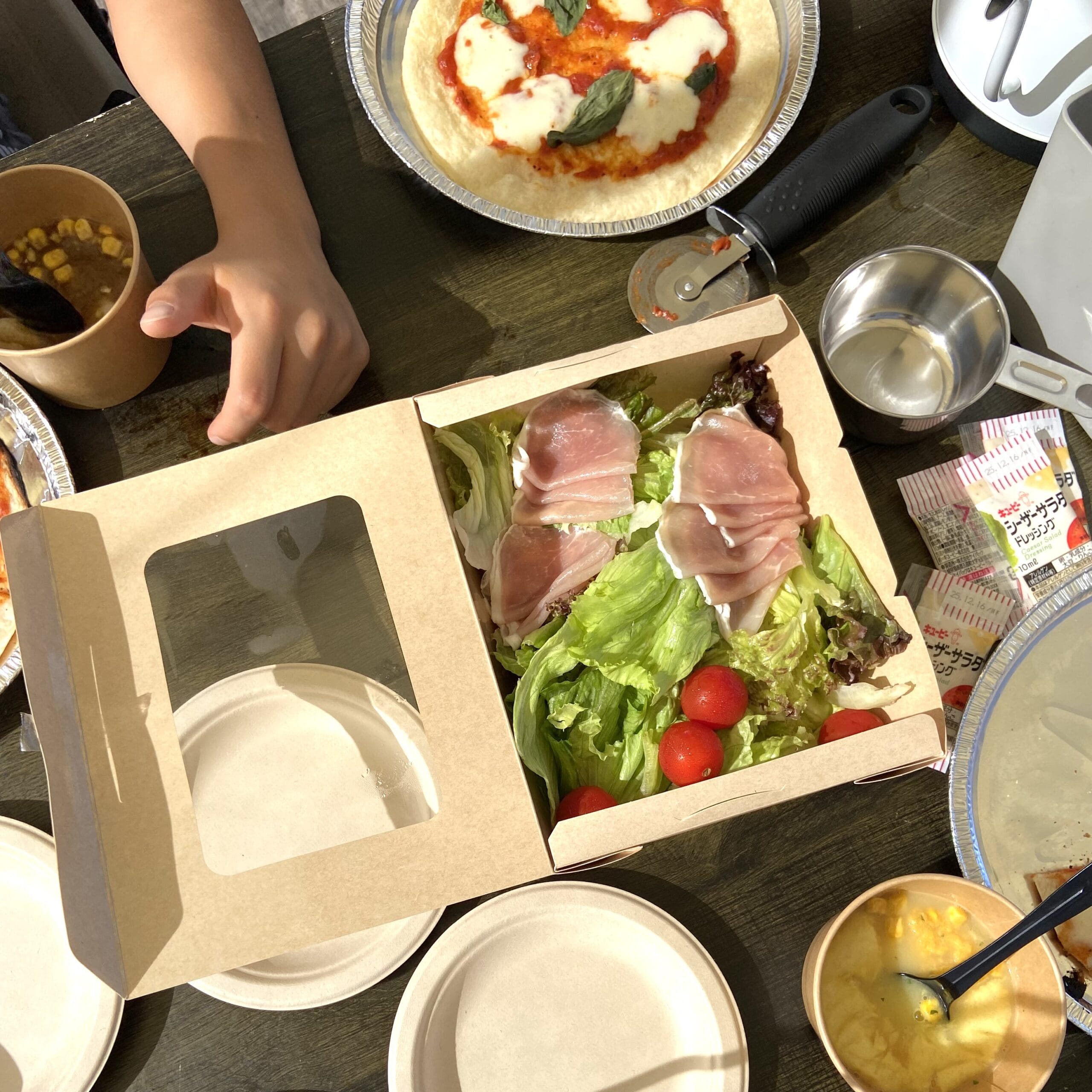翌日の朝ごはんは生ハムサラダと手作りピザ。