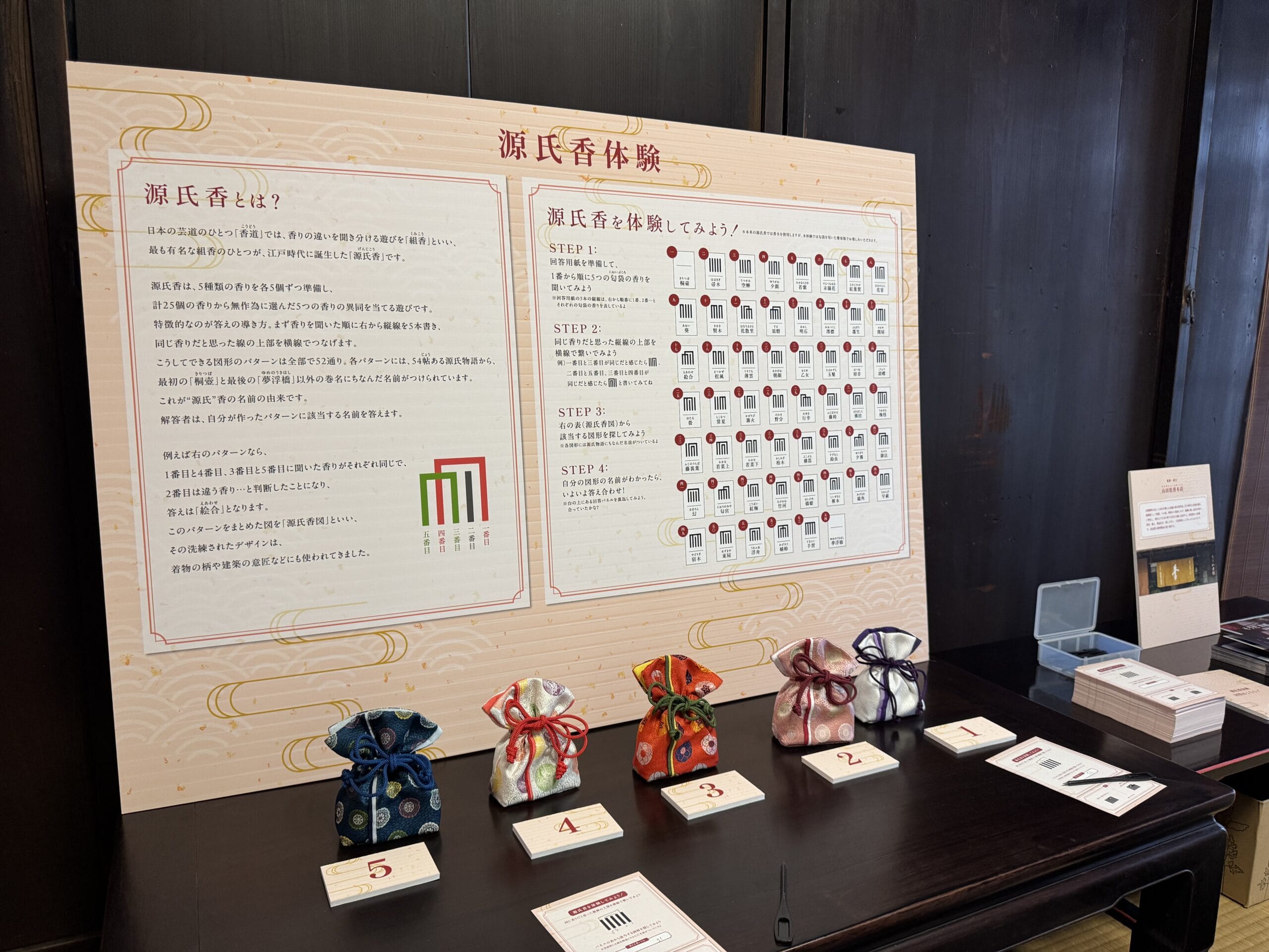 何個か匂い袋が置いてあって、同じ香と思うもの選び、紐づけた時にできた紋様で正解を確認するという雅なものでした。