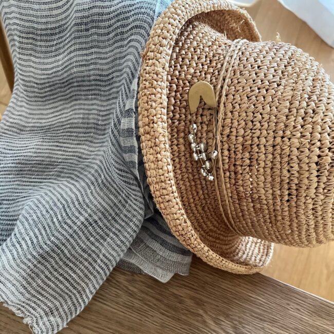 こんな感じで夏は帽子につけたり、リネンのストールのポイントにしたりと、このピンを添えるだけで、これまで使ってきたアイテムをまた新鮮な気持ちで楽しめそうです。