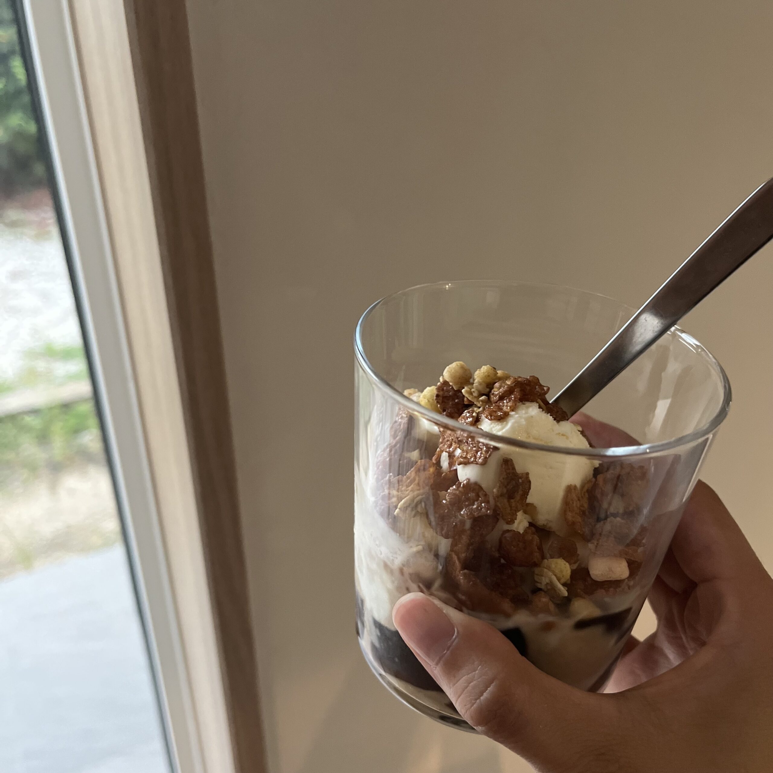 これはアイスで脂質を摂ってしまいますが、コーヒーゼリー+バニラアイス+素材まるごとグラノラ 脂質70%オフ 華やぐフルーティショコラの組み合わせはおやつでやってみたら最高に美味しかったです。