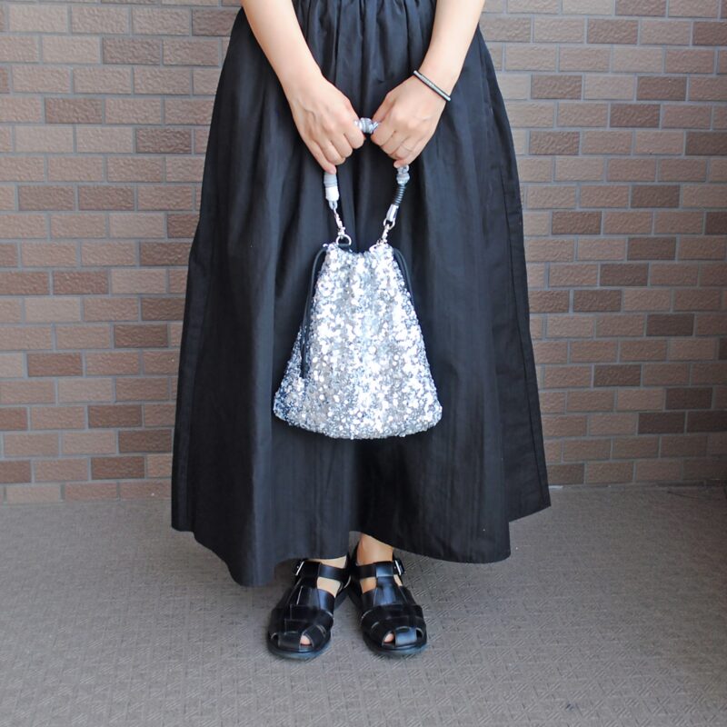 モノトーンのアクセントにスパンコールのキラキラバッグと、パラブーツのグルカサンダル、腕には yohei noguchi のブレスを。