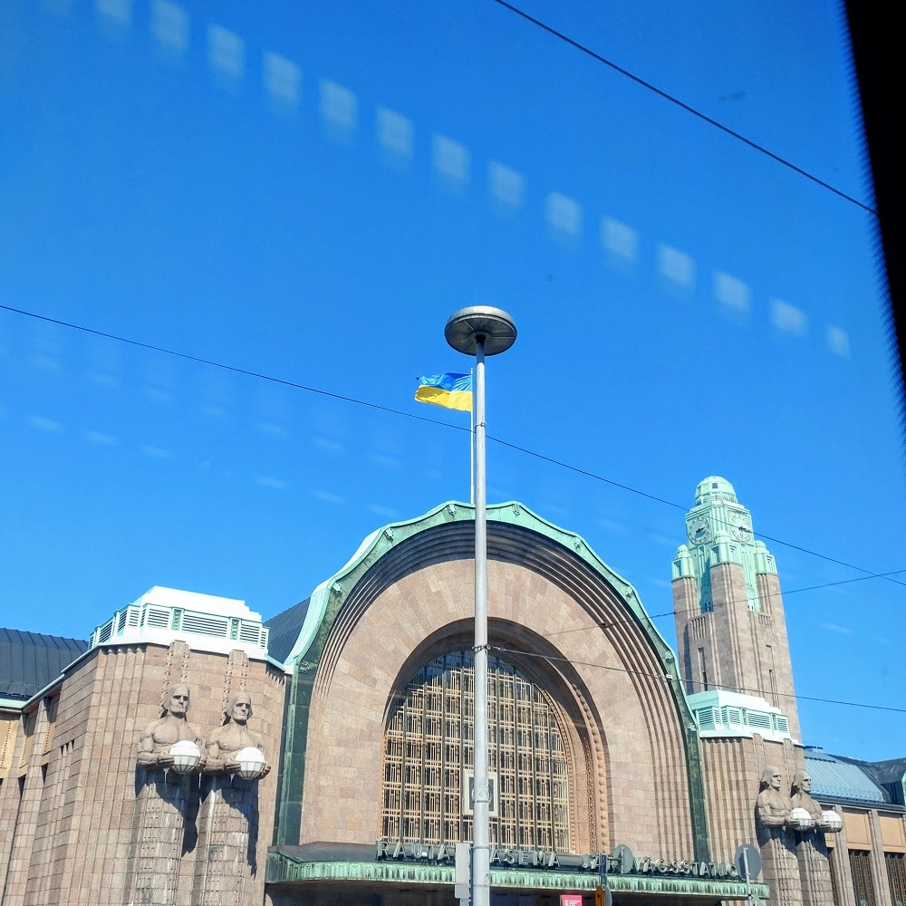 トラムの車窓から見るヘルシンキ中央駅に他国の国旗が掲げられていました。こんなメッセージ性の強いものがあるのかと。飛行ルートも世界情勢を反映したものだと感じました。