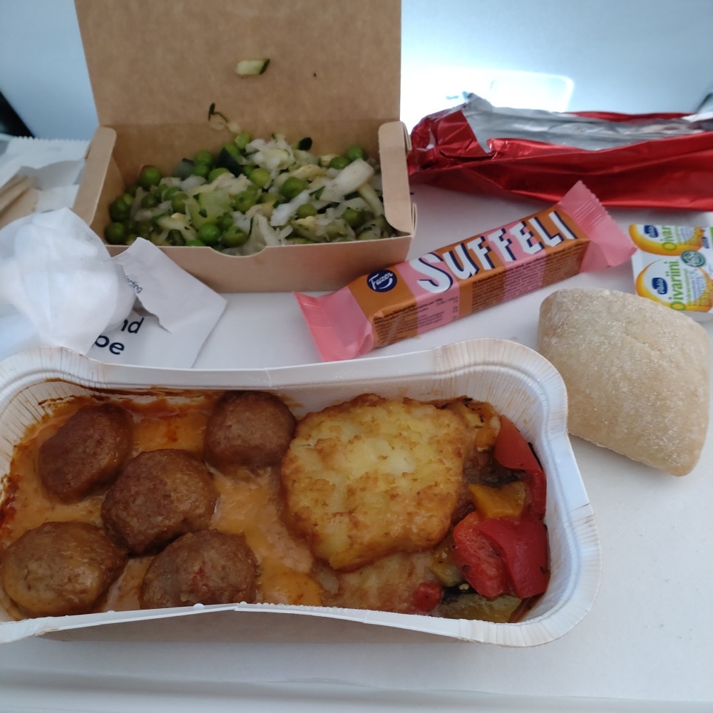 (メニュー:フィンエアーの記載より)ミートボールのクリームソースがけ、ハッシュブラウンと野菜のロースト添え