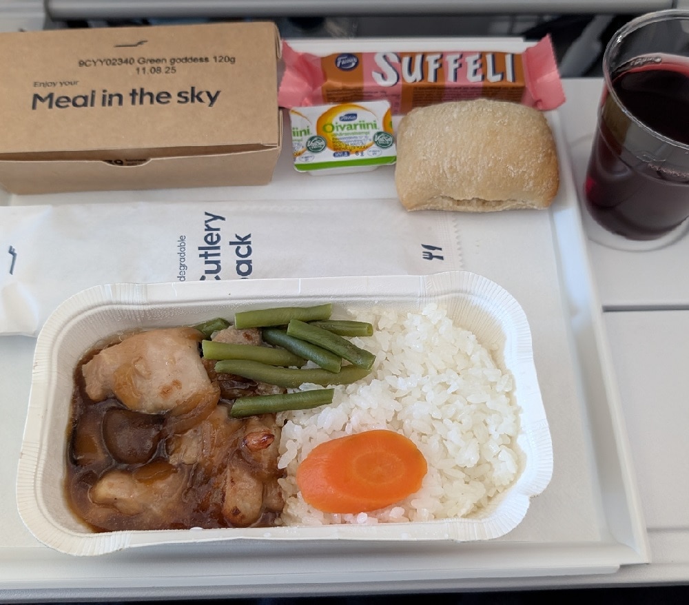 (メニュー:フィンエアーの記載より)和風チキン、椎茸と各種野菜の醤油和え、ごはんを添えて