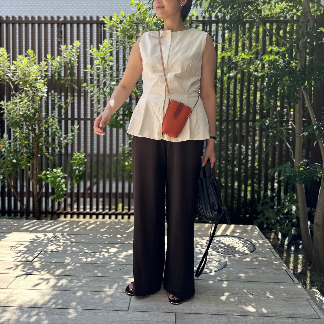 ブラウンベースで統一。バッグやサンダルをブラックにすることで色がボヤッとせずに締まります。このままだと全体的に色がないのでスマホケースはカラフルなものを選びました。