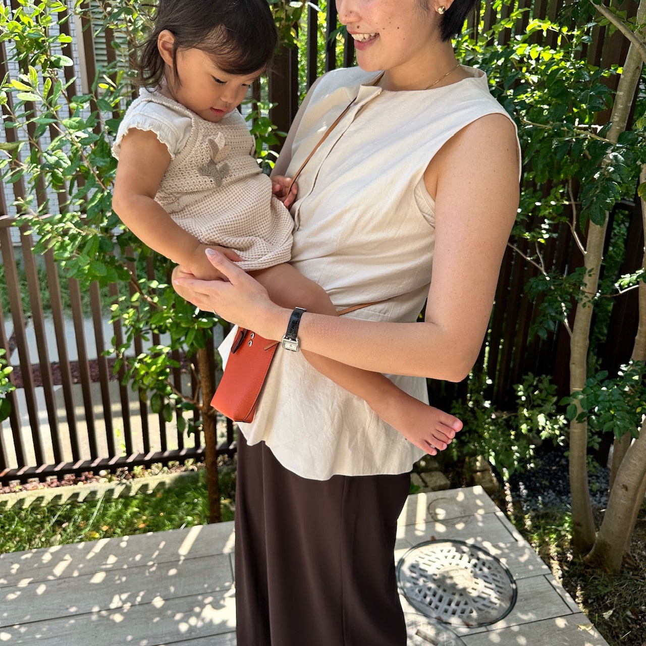 次女を抱っこしても統一感が。どことなくレトロさもある次女のワンピースはTシャツの上に着るだけでちょっとしたお出かけにも使えるため重宝しています。
