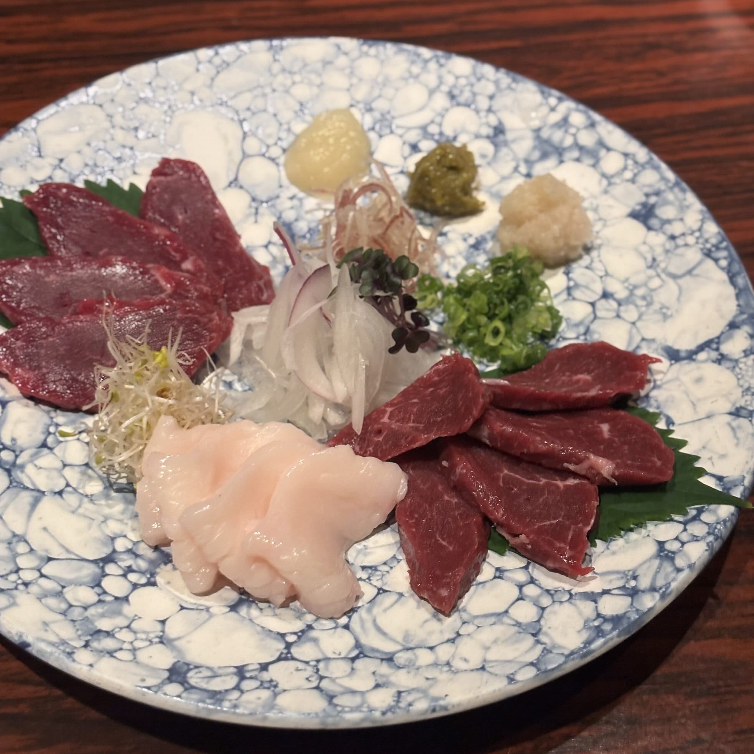 馬のお肉ってちょっと癖があるのかなーと思っていましたが、そんなことは全くないんですね。食べやすかったです。真ん中のピンク色のタテガミがじんわり甘くて口の中でとろけました。美味しかったなぁ。