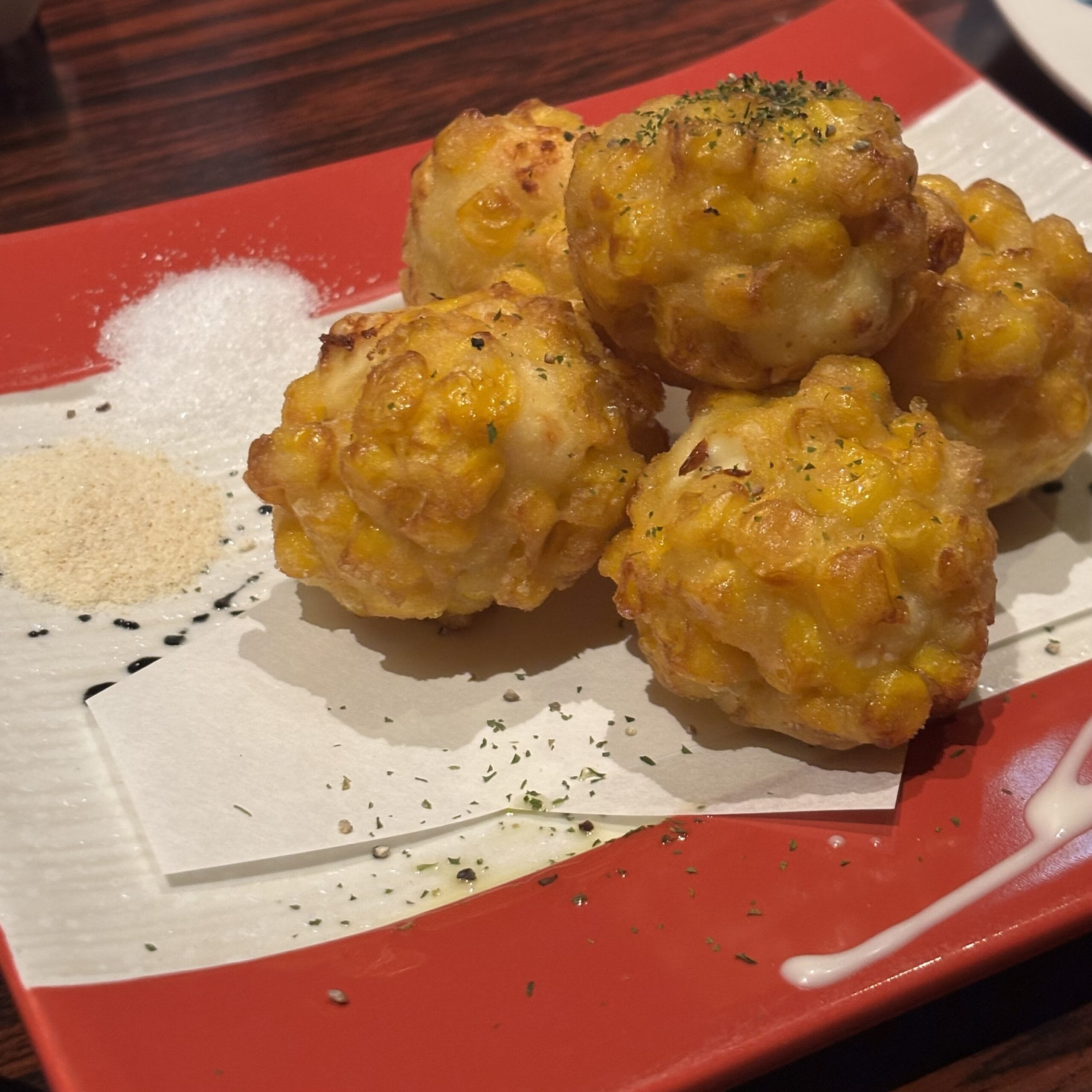 とうもろこしとクリームチーズのかき揚げはサクサク。カレー塩をつけて食べます。
