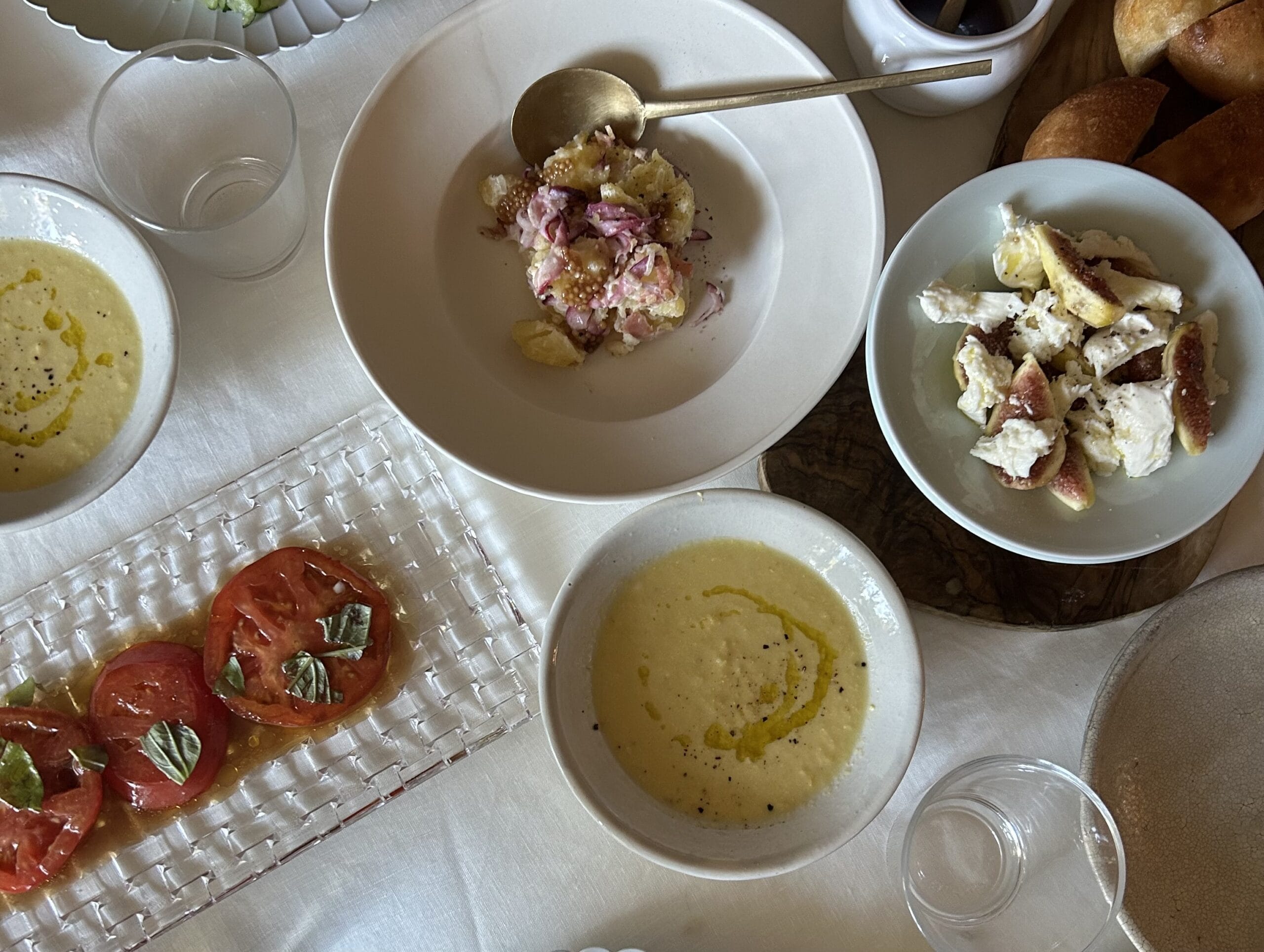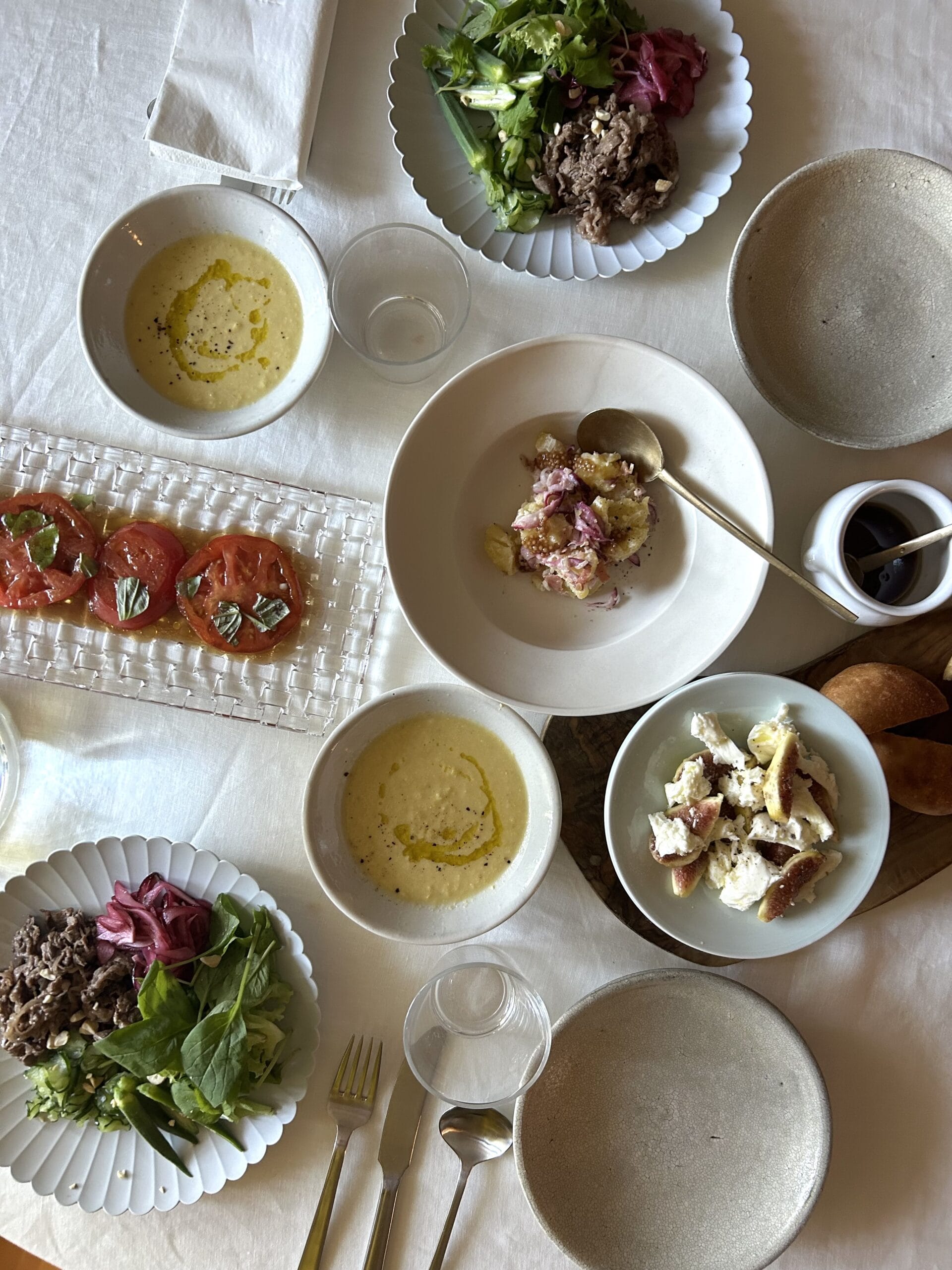 ポテトサラダとメインの牛肉のエスニックサラダを作って、いちじくとモッツァレラは食べる直前に切ってちぎって盛り合わせただけ、