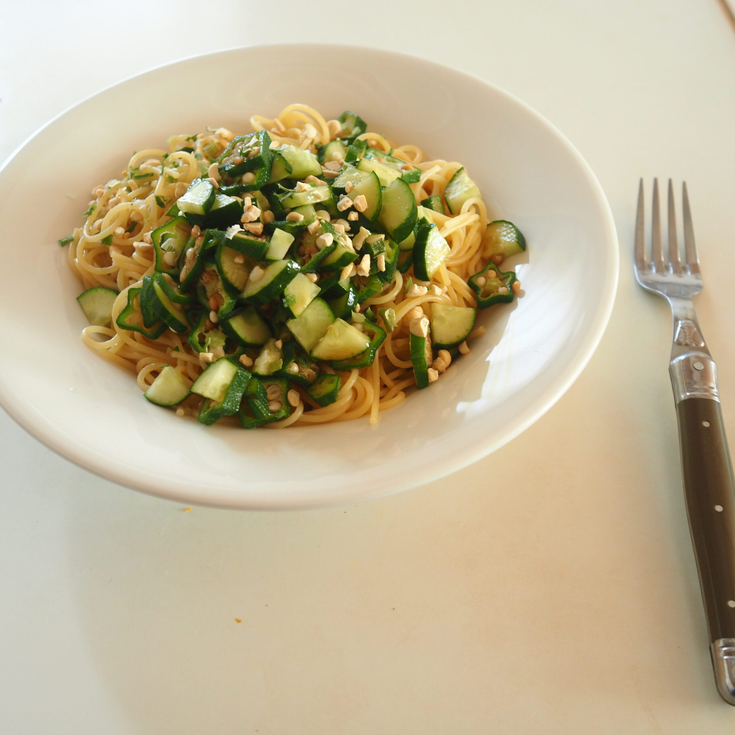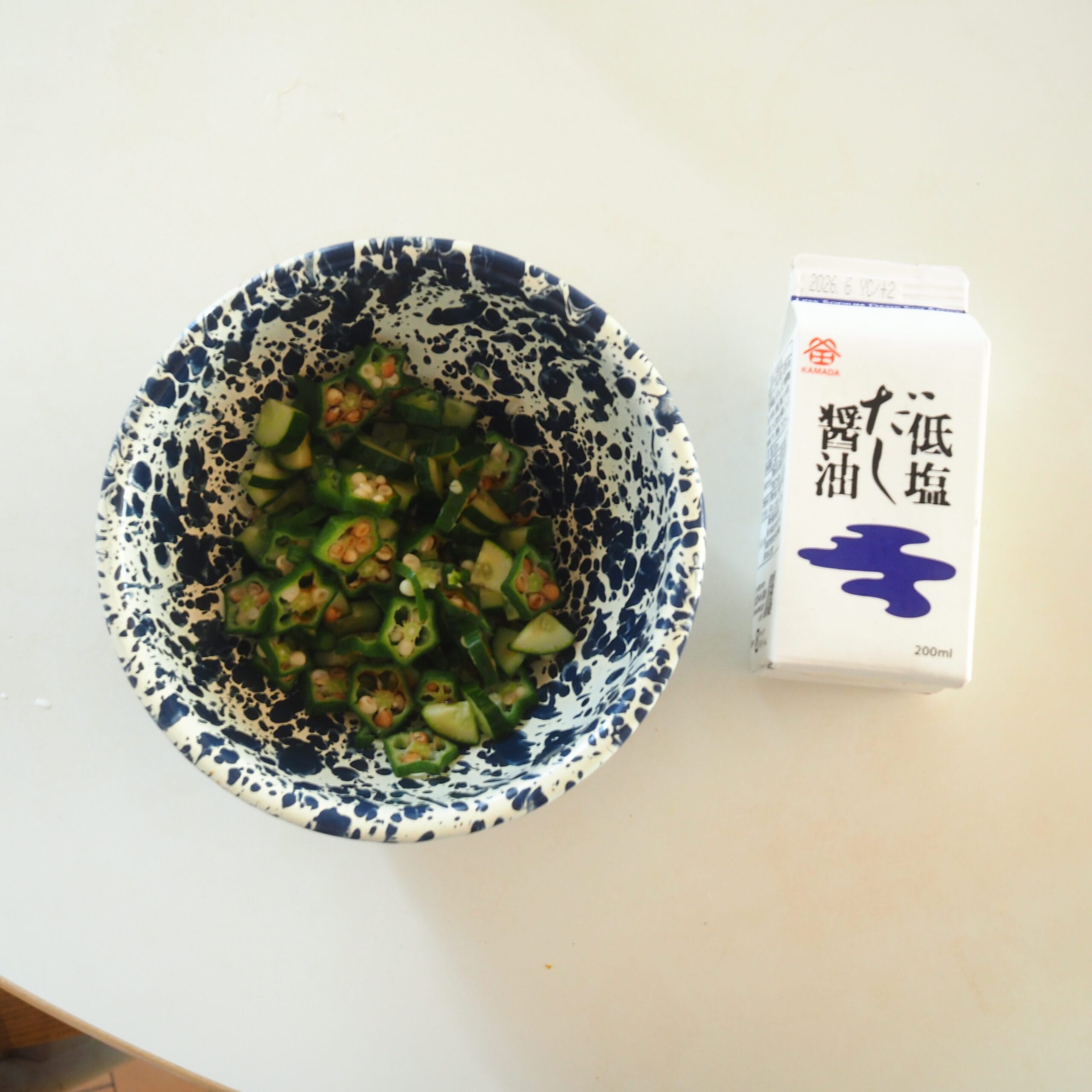 おいしいのはもちろん、「あえるだけ」という簡単さから、昼ご飯によく作っています。栄養面を考えて、大体そのときにある合いそうな食材をトッピングすることが多いです。このときはオクラときゅうりを刻んだものを。