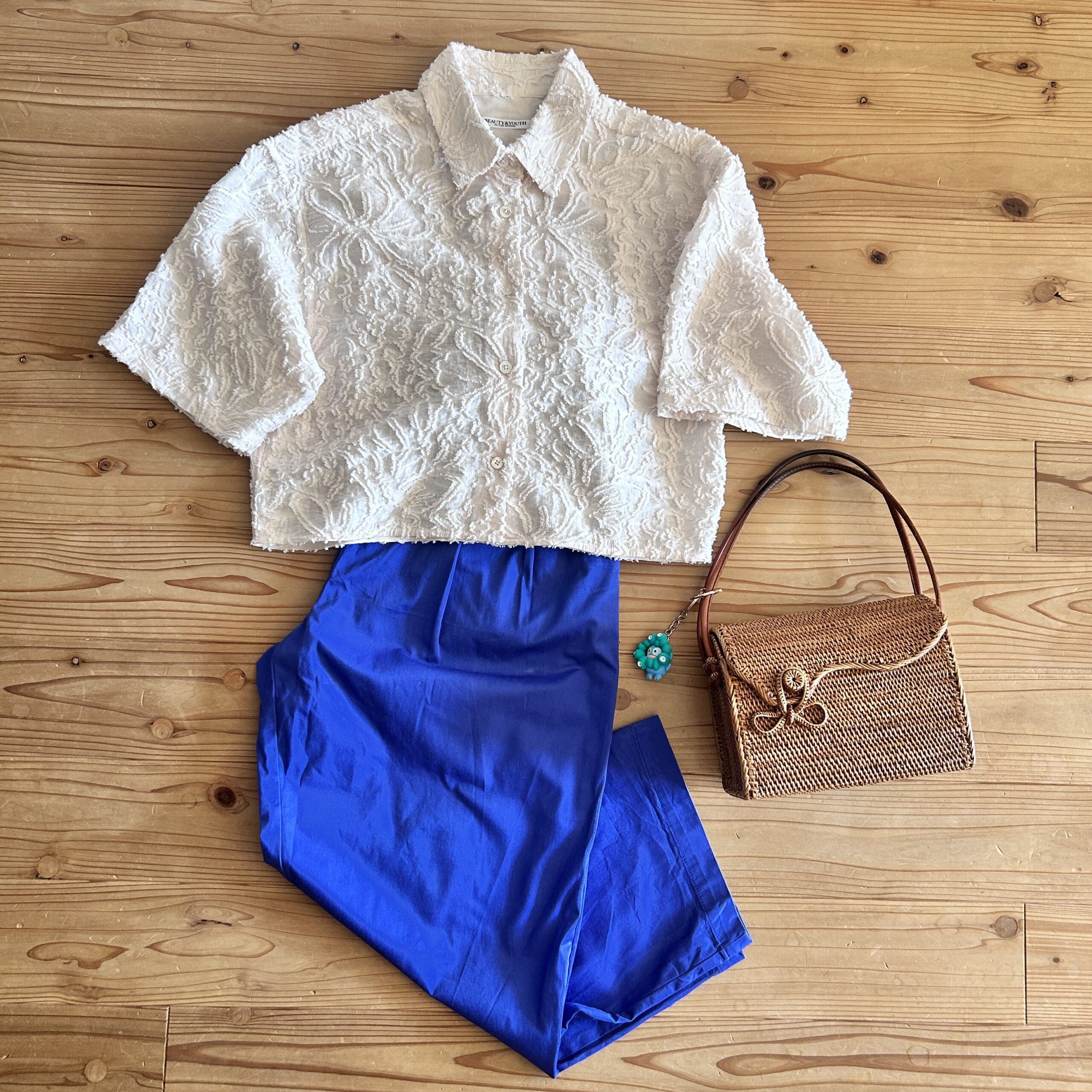 それに手持ちの BEAUTY&YOUTH のブラウス、大昔にバリ島で購入したカゴバッグを。