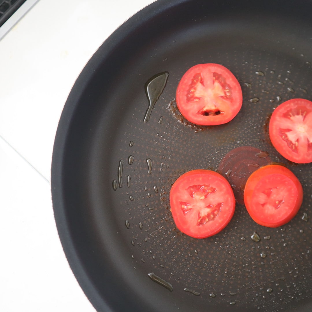 トマトは、オリーブオイルで両面に焼き色がつくようにサッと焼く。ジューシーで深みがでて美味しかったです♡