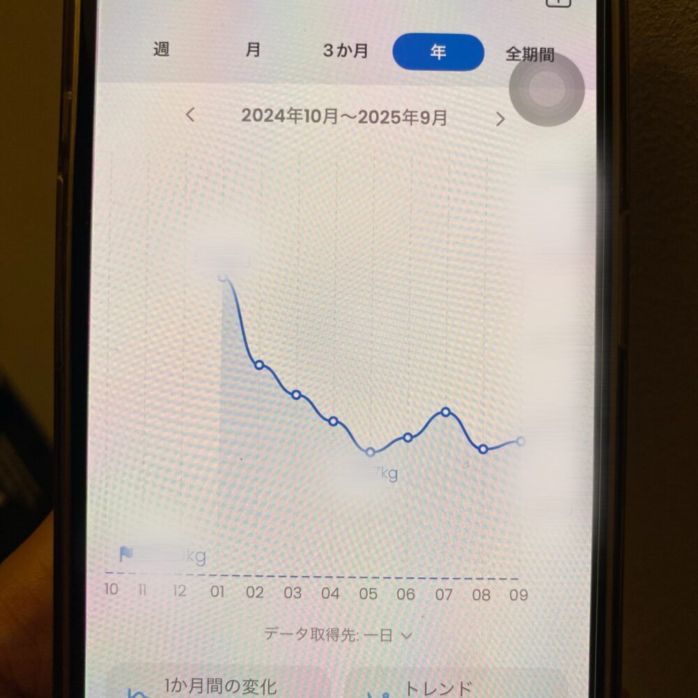 そして今週はこちらの画像をどうぞ。体重計を変えた今年の1月から9月の体重データです。はい、6、7月にリバウンド完全にやらかしております!!!あの2ヶ月もったいない😢