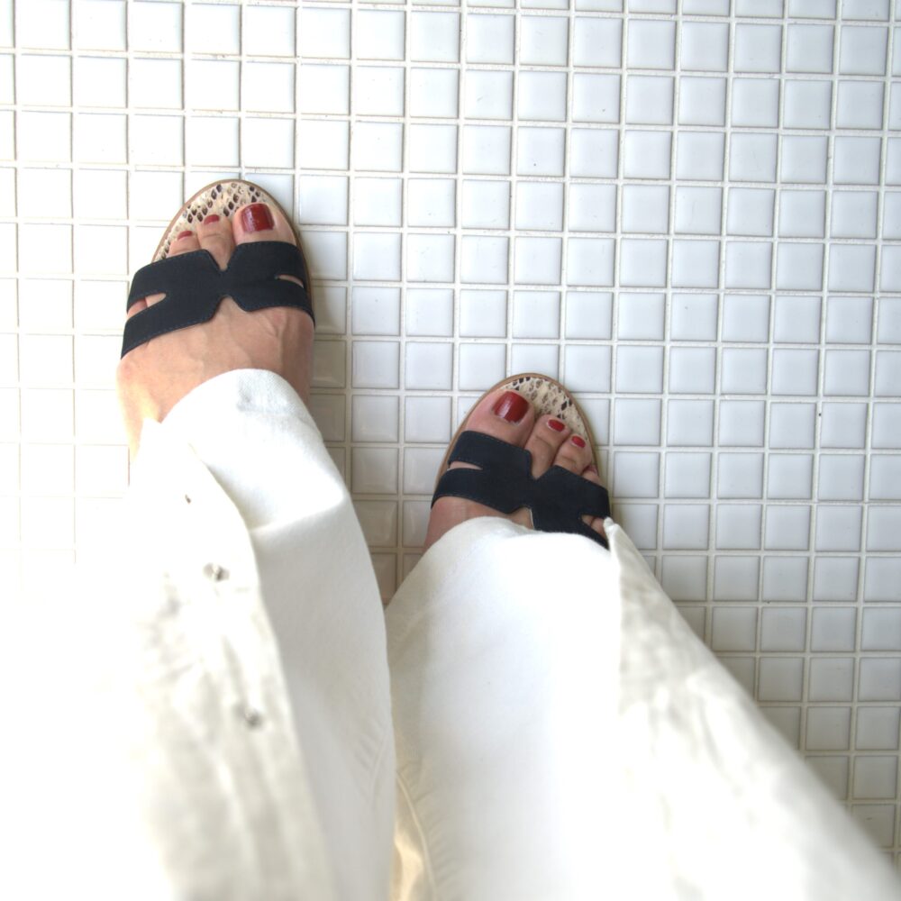 落ち着いたネイビーのサンダルに赤いペディキュア。バッグはイエロー。