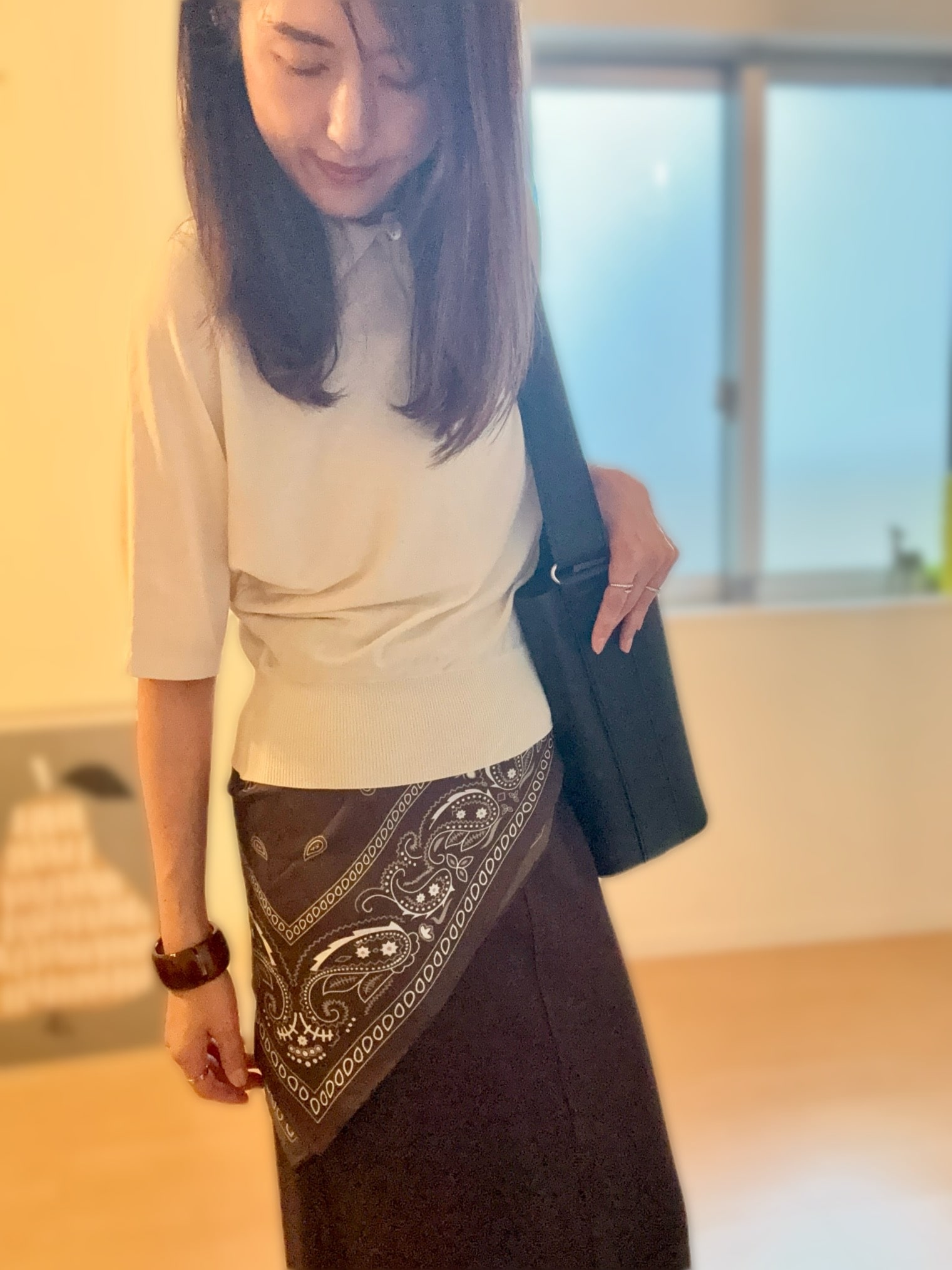 スカーフはシルク100%なのにお手頃価格でした。ブラウンのバンダナ柄です。トレンドのスカーフ腰巻きを初挑戦。
