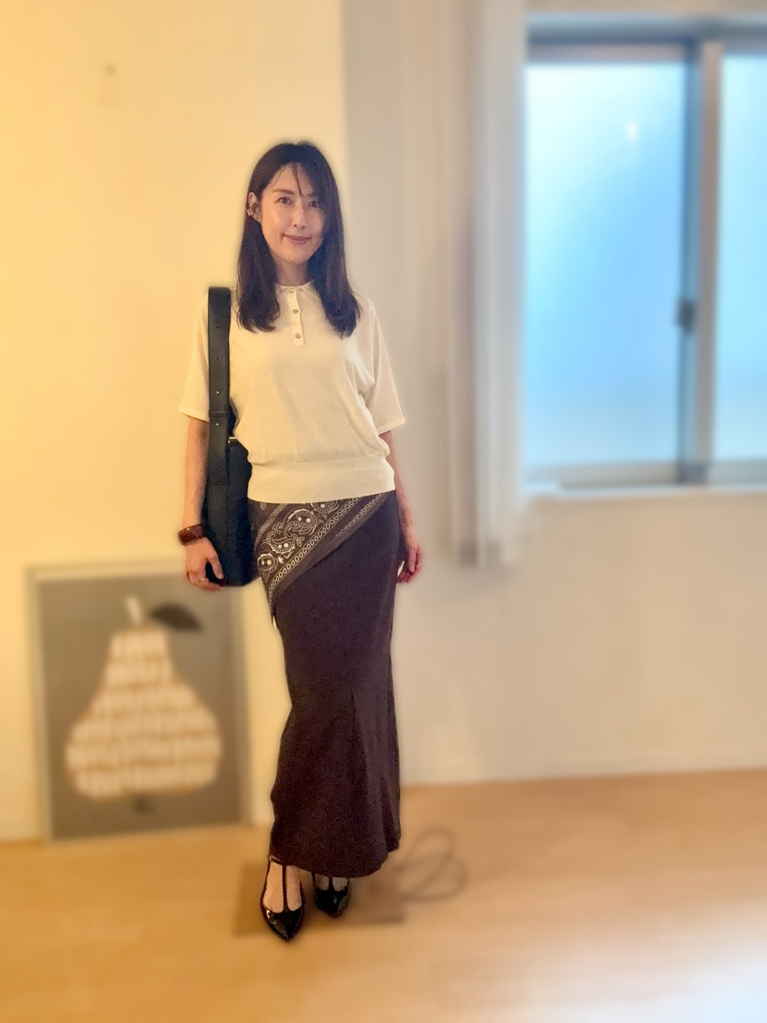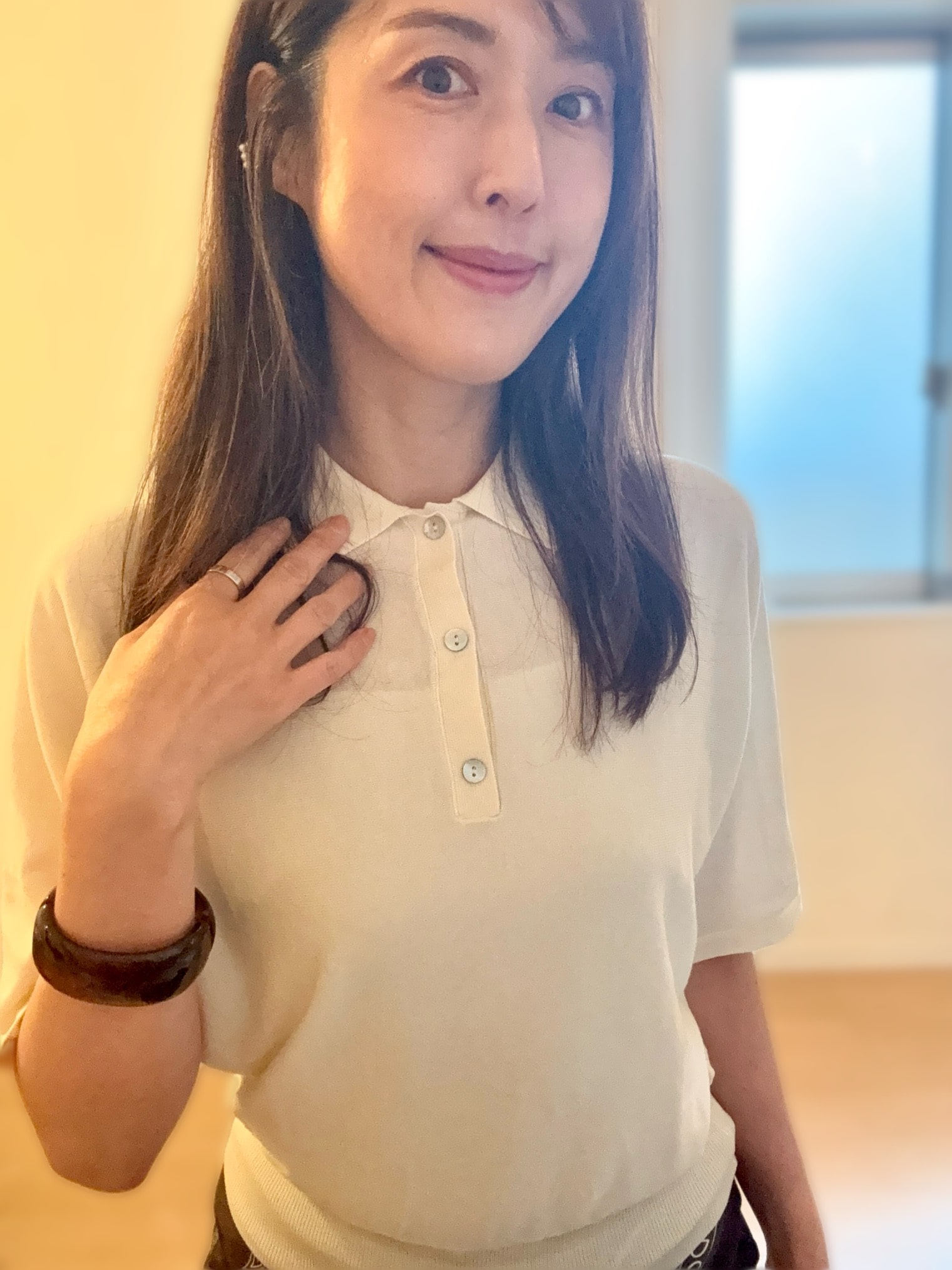 買ったばかりのアイボリーのニットポロ。シェルボタンが良い感じではないですか。