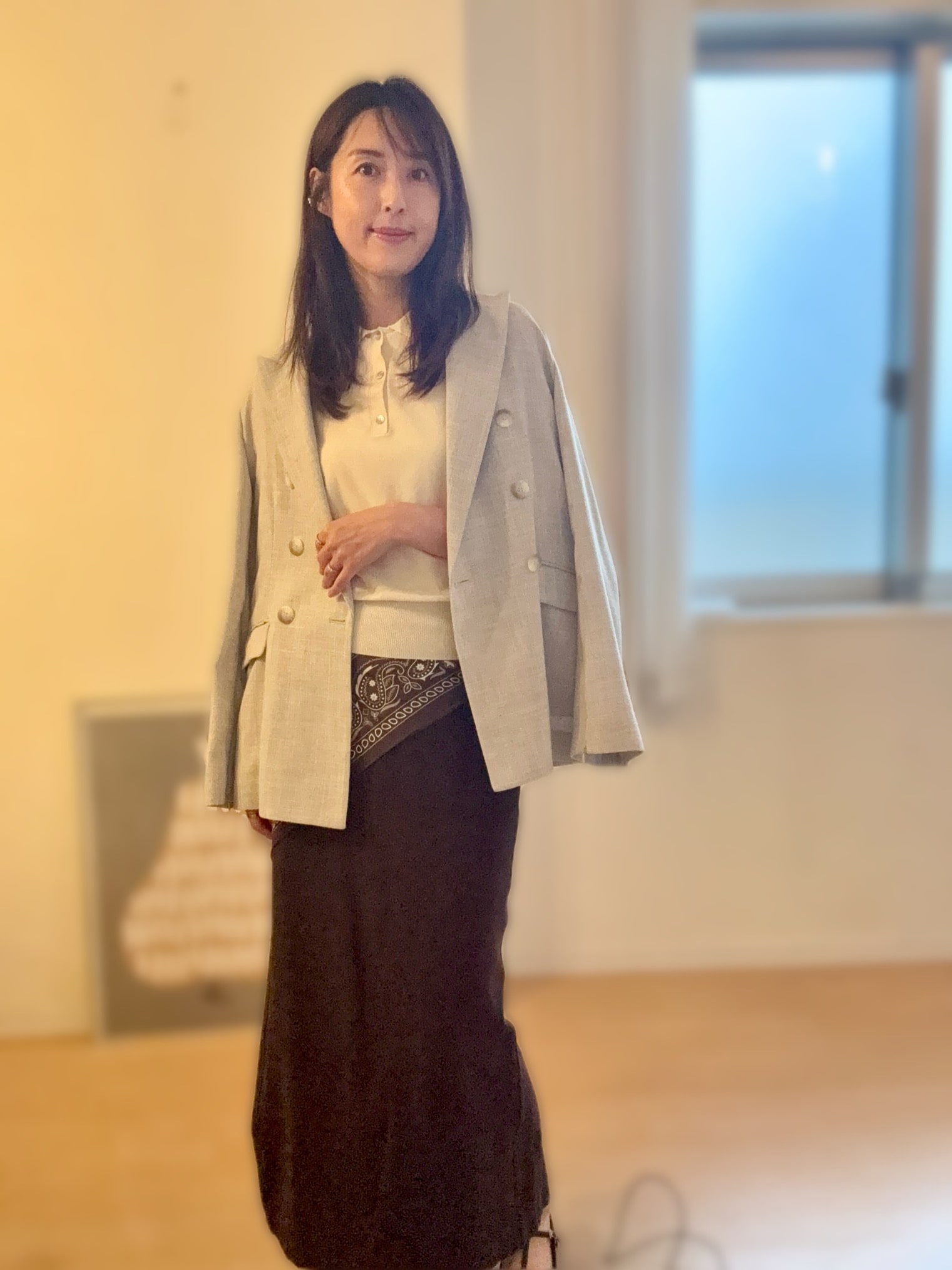 今日は肌寒いので、春によく着ていたnobleのスリット袖ジャケットを引っ掛けて更にお客様対応。