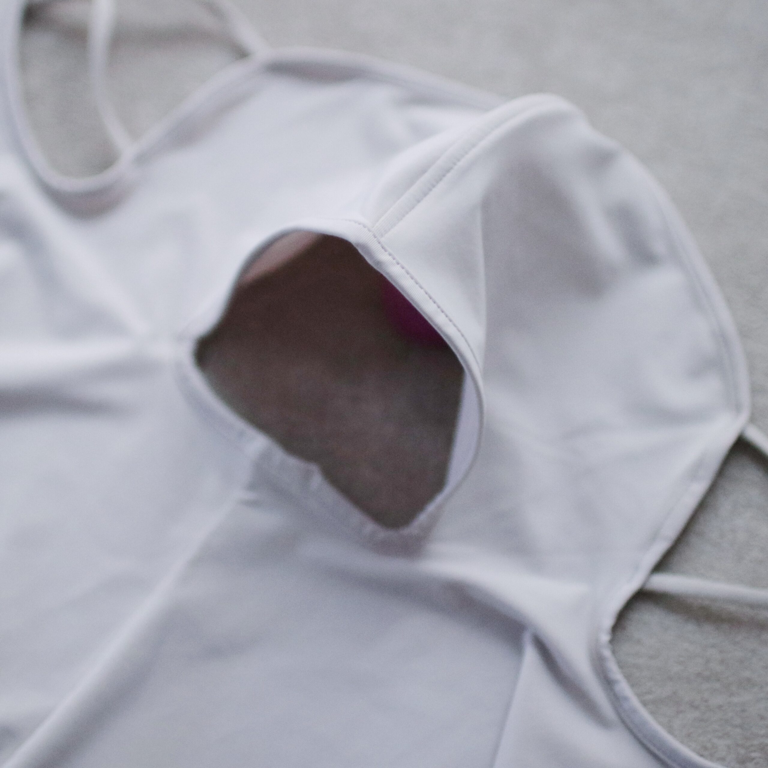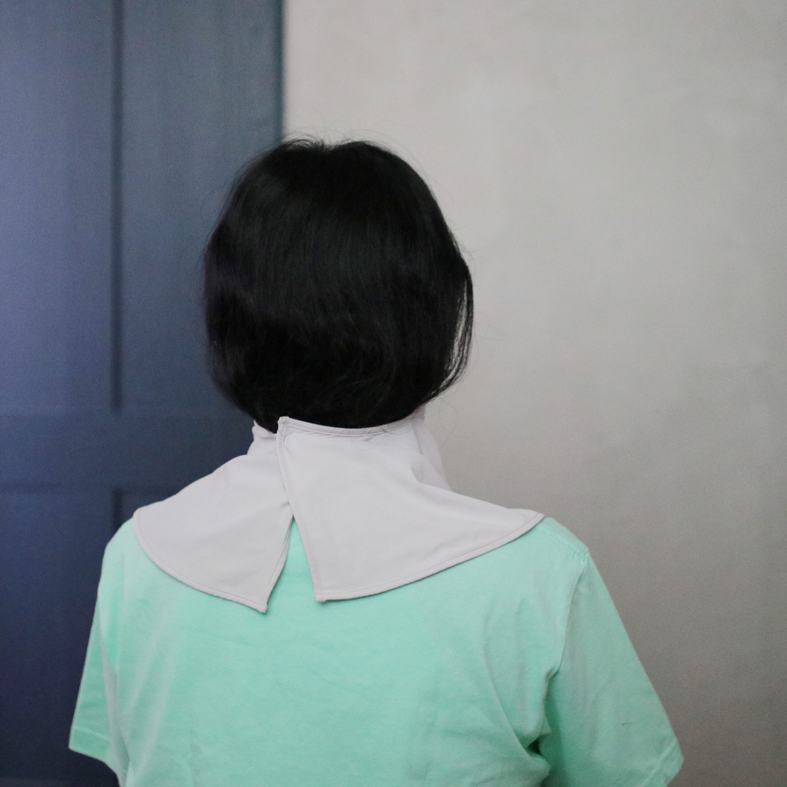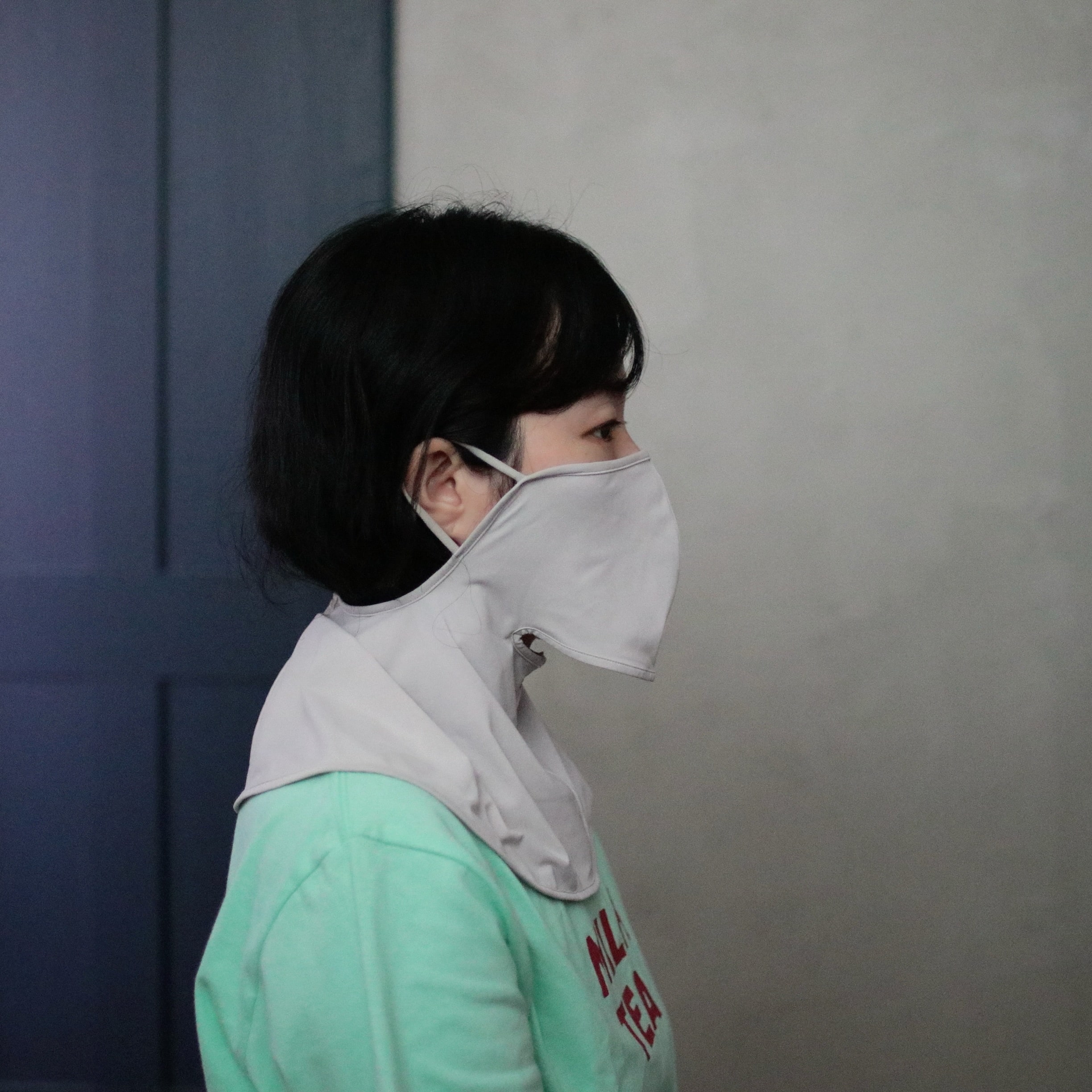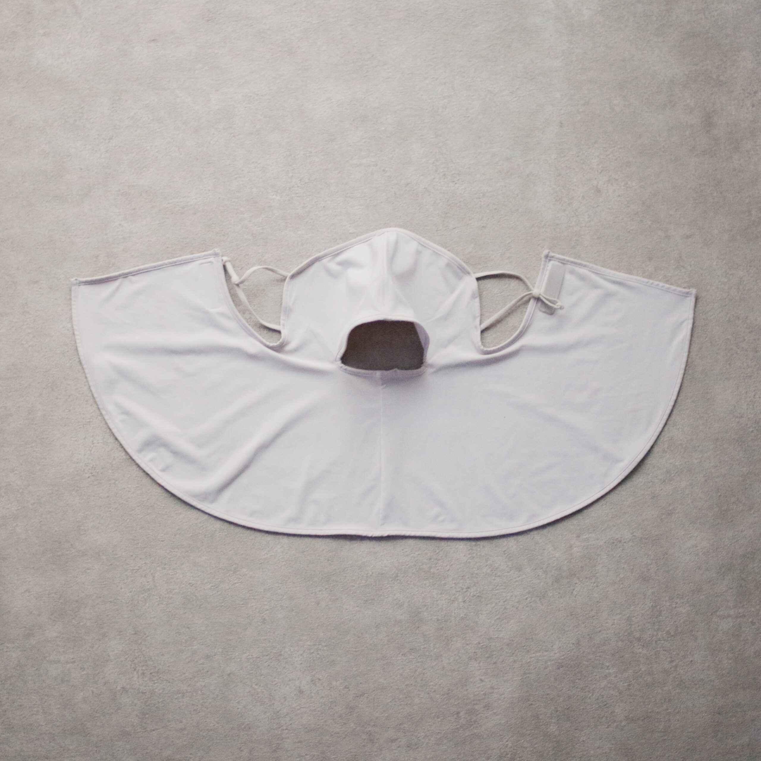 マスクのような形ですが、首周りと顎の部分の境目に穴が空いている形状になっていて、口元に空間ができるので呼吸がしやすくて安心◎
