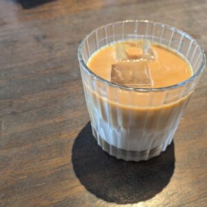 自家焙煎のコーヒーショップで私はオーツミルクラテを注文。