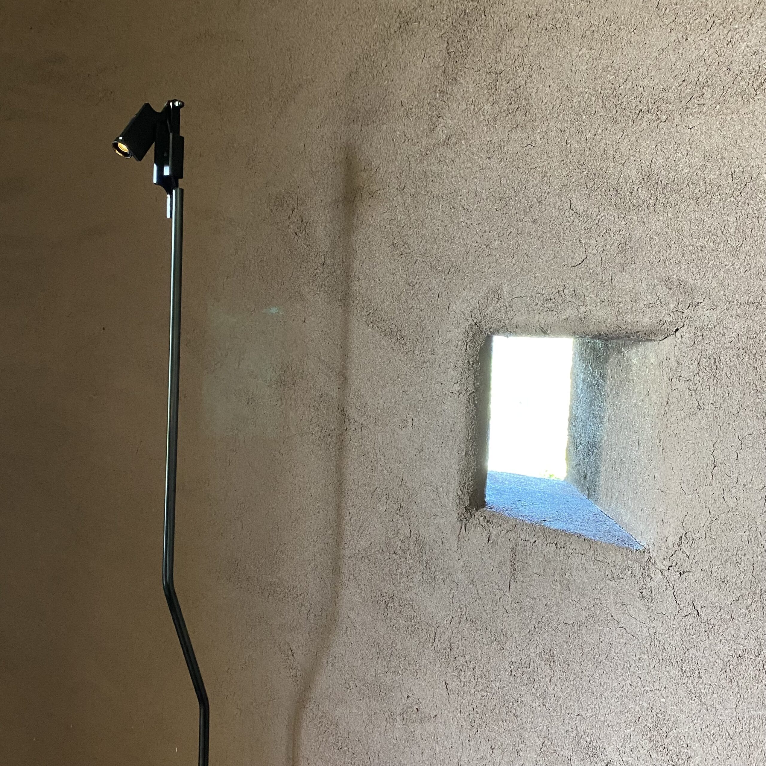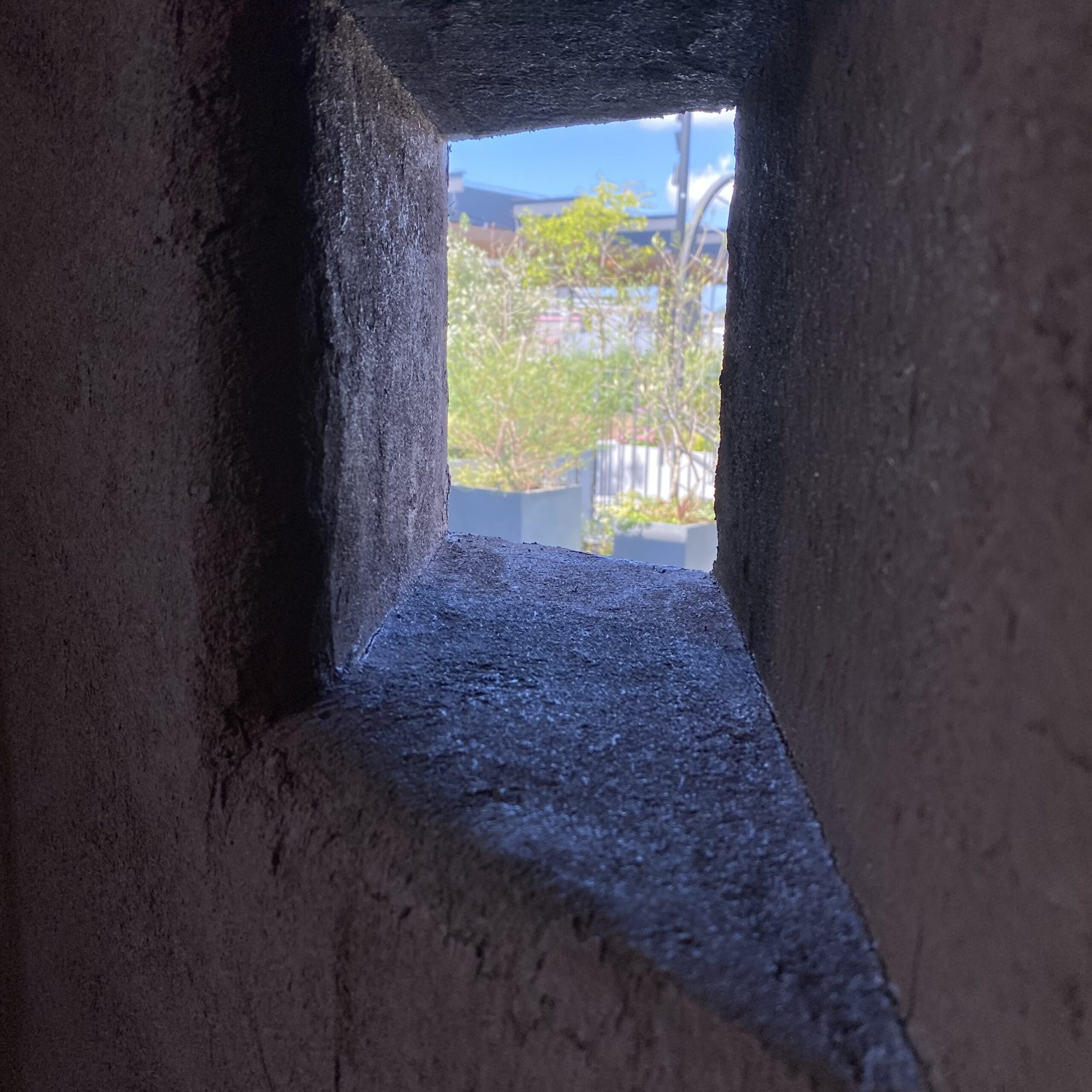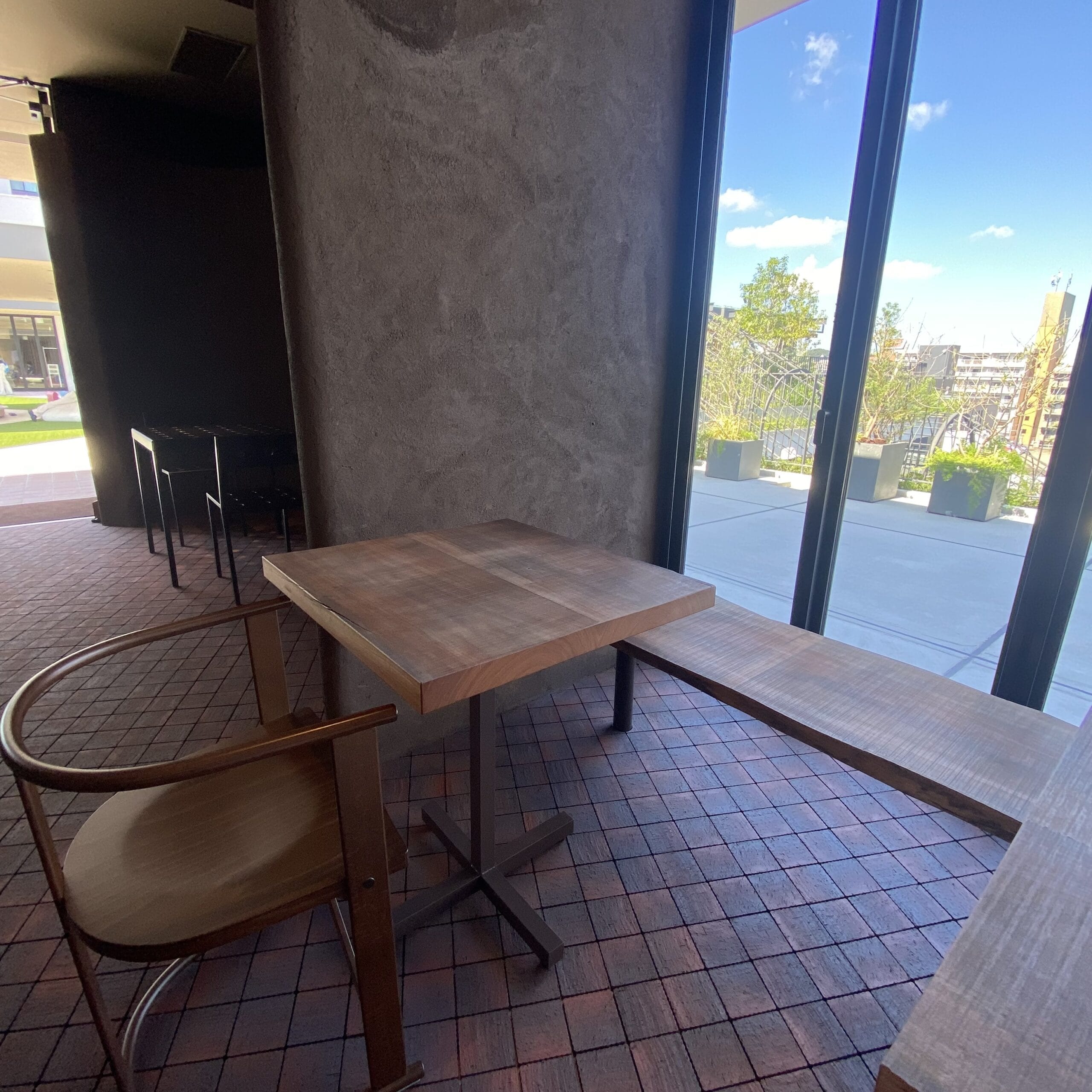 壁側の席はこんな感じ。土壁には、捨てられるコーヒーの粉末を仕上げ材として再利用するなど、こだわりが。