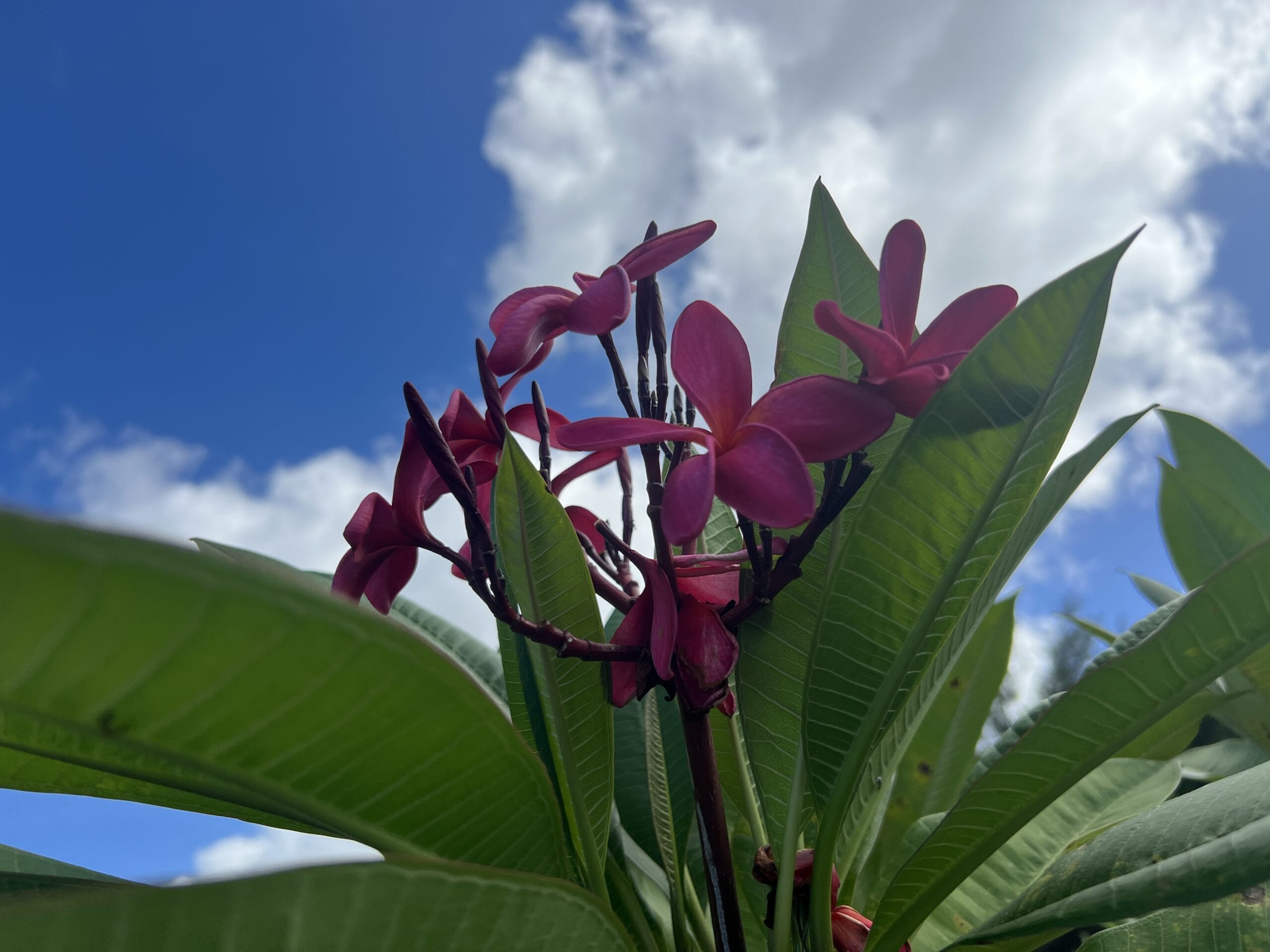 買い物途中にピンクのプルメリアを見つけました。鮮やかな色が青い空にぴったり。