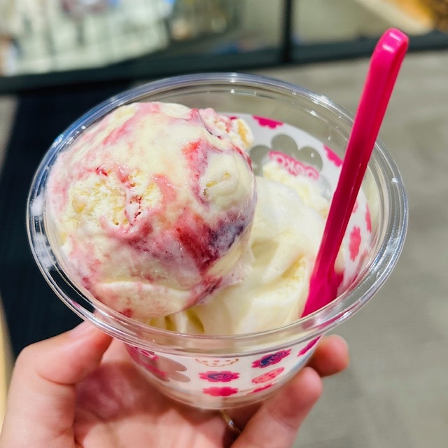 ミルキー風味のアイスに、ミルキー風味のリボンとシャーベットが入っていて、まさにミルキーを食べているかのような味わいでした。