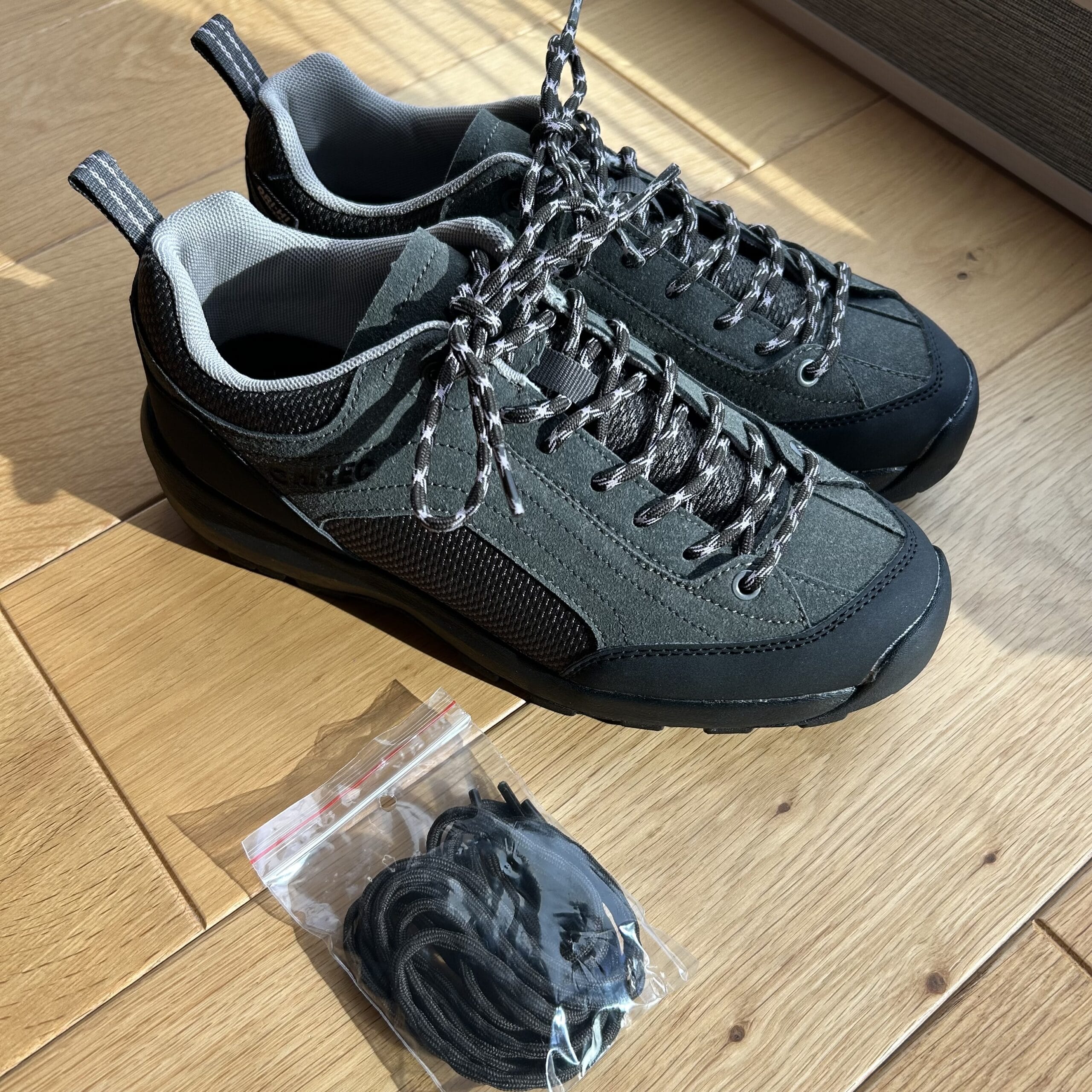 高機能ながら、ほどよいボリューム感なので普段の格好に馴染みます。現在、LEEマルシェで取扱のカラーはチャコール、ベージュ×ブルー、ブラックの3色です。配色も「ザ・山歩き」なアウトドア感ではなくて良いです。シューレース(紐)は、写真でつけている柄タイプのほかに、シンプルな単色タイプもついてきますので、好みに合わせて選べます。ブラックの方の柄紐は、暗いところでちょっと光る感じが。(錯覚?)モードな感じでかっこいいです。
