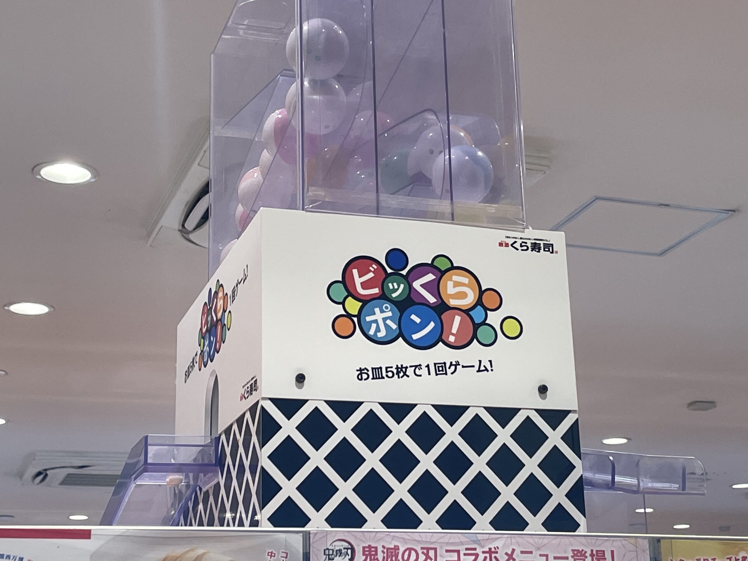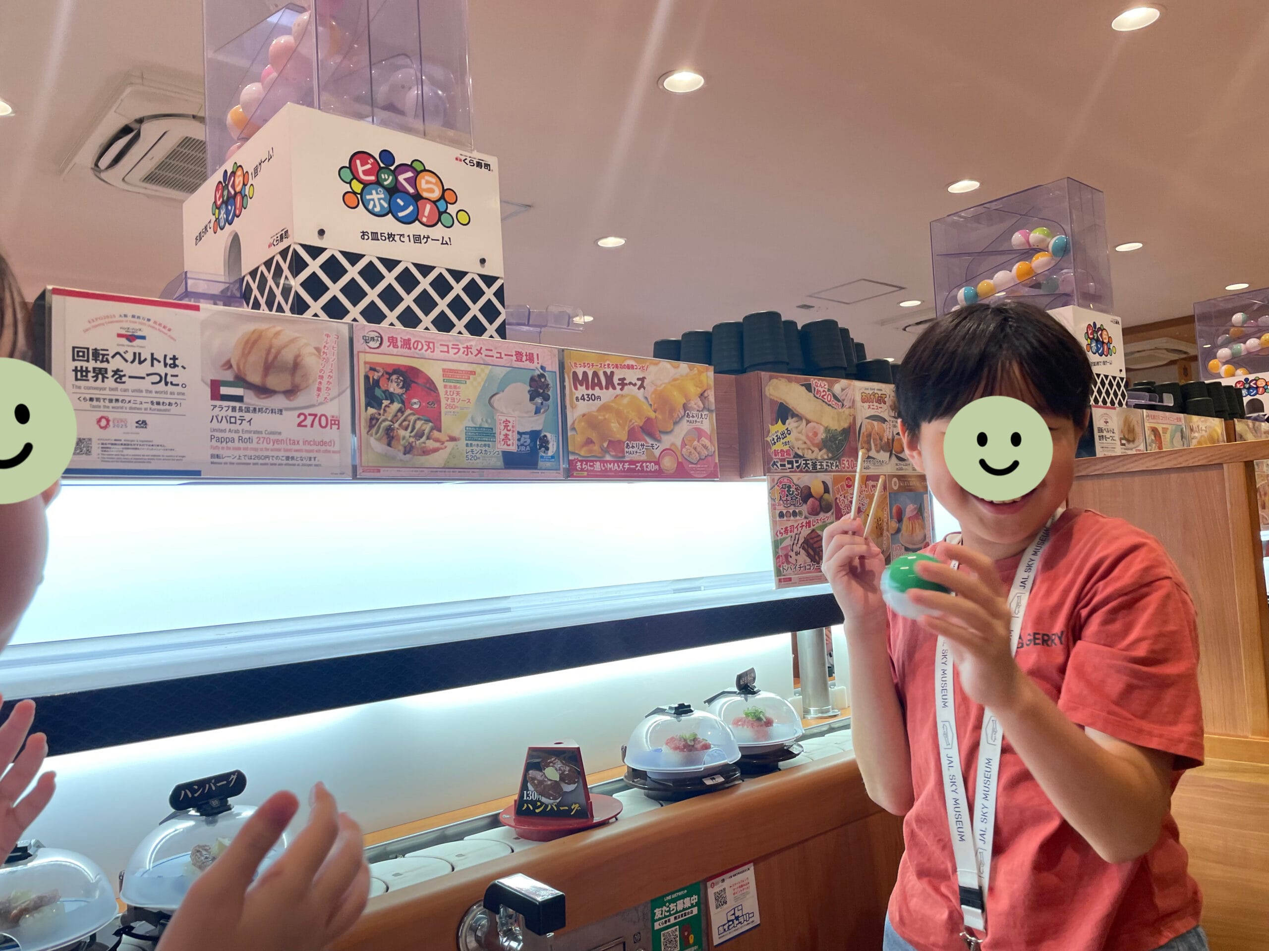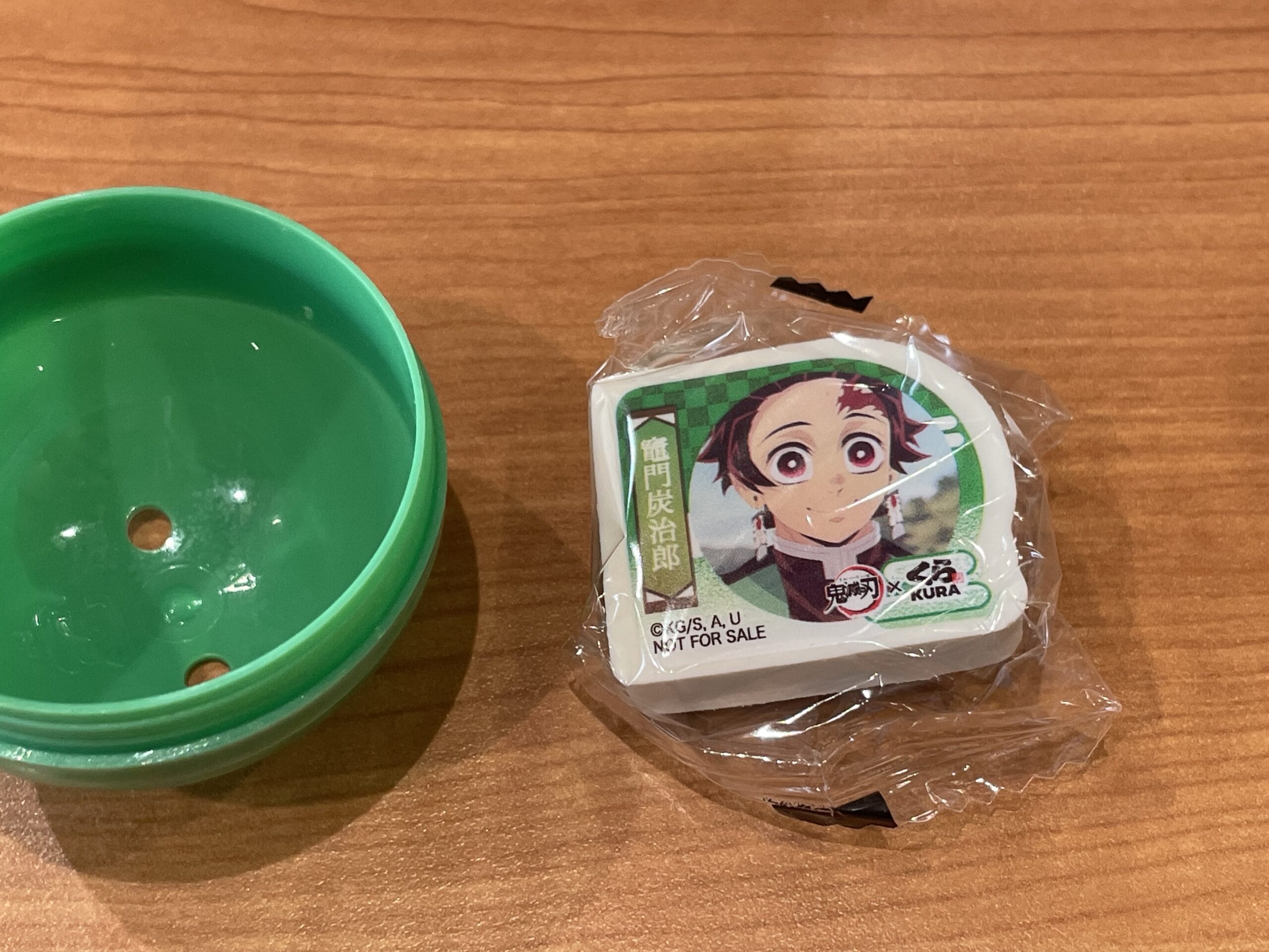5皿食べるごとにクジが引ける「ビッくらポン!」も初体験!!5枚入れた時点で当たり→カプセルが転がって出て来ます!!炭治郎の消しゴムが入っていました。(しかしこれはビギナーズラックでしたね…。結局28皿食べましたが、この1回しか当たらずでした…笑)
