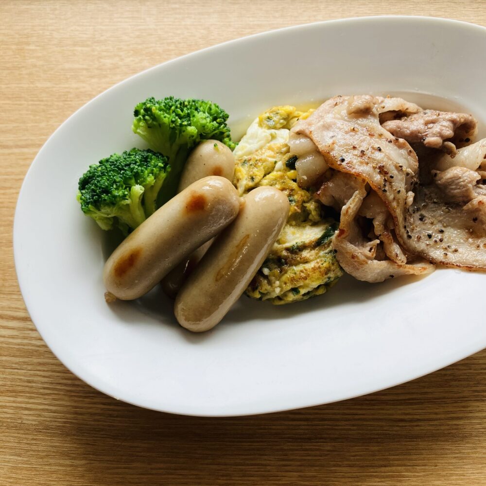 次の日の朝食にも活用。豚肉の脂身まで美味しいので味付けは塩胡椒だけで満足。
