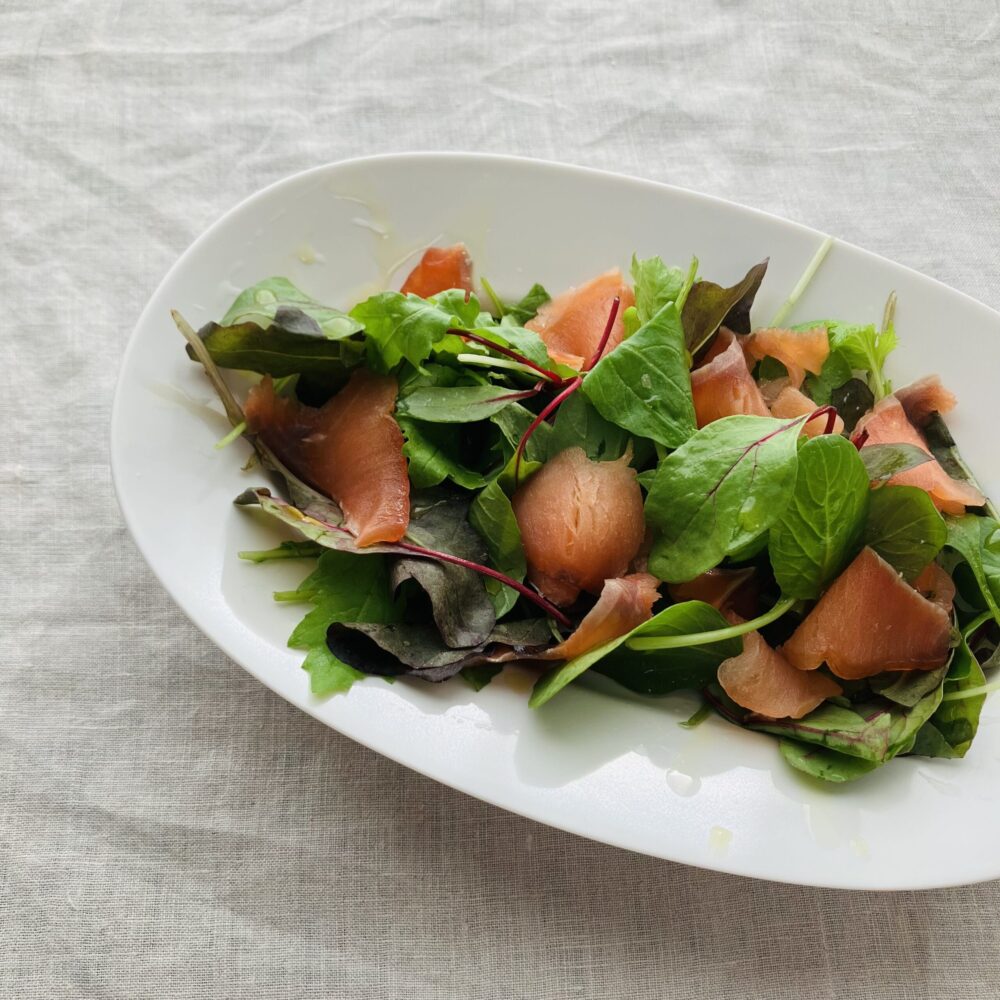 ベビーリーフに流水解凍できるスモークサーモンを添えるだけで立派なサラダに。