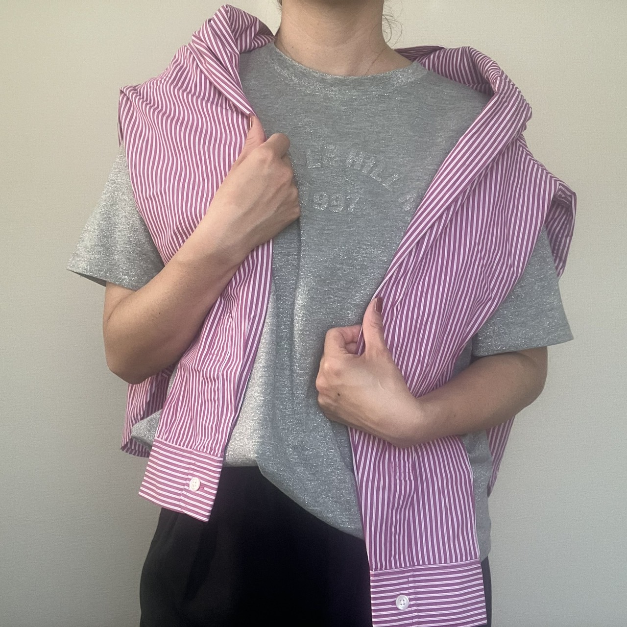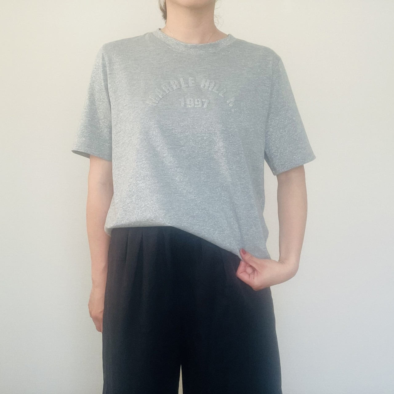 ラメは最近気になる素材の1つです。薄めのスウェットのような生地の半袖Tシャツなので、こちらも長く着られそうです。