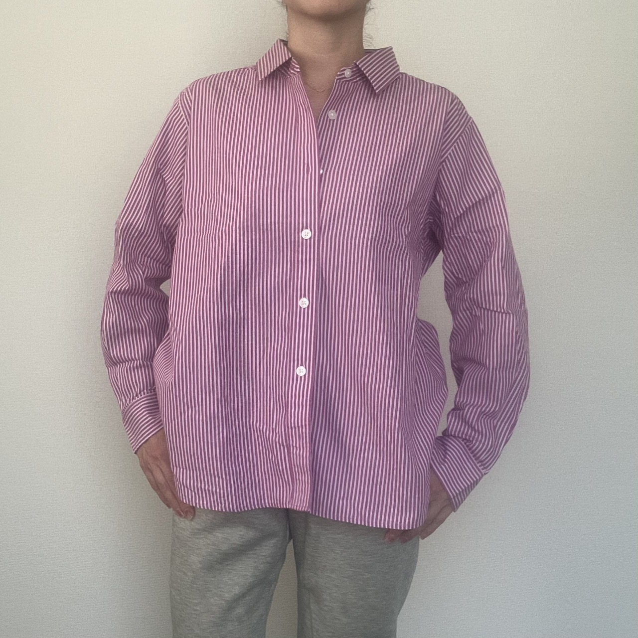 ピンクストライプシャツ。UNIQLOのスウェットパンツ(昨年購入)と合わせています。