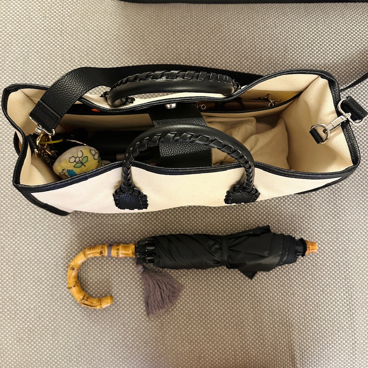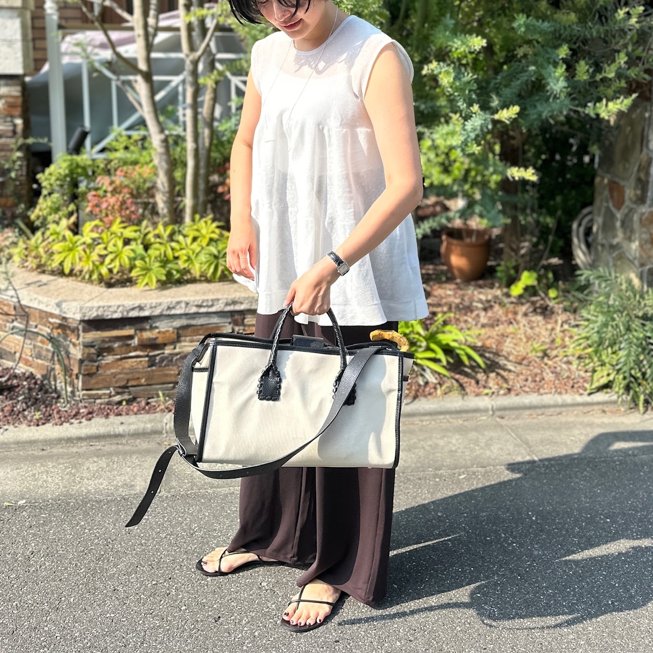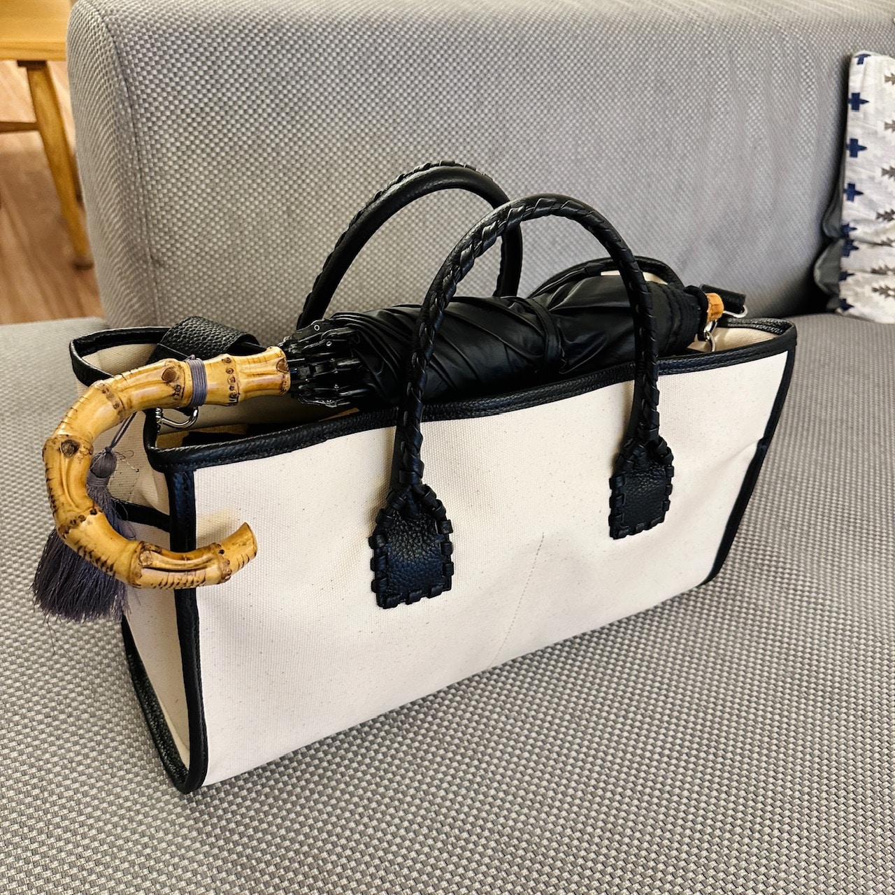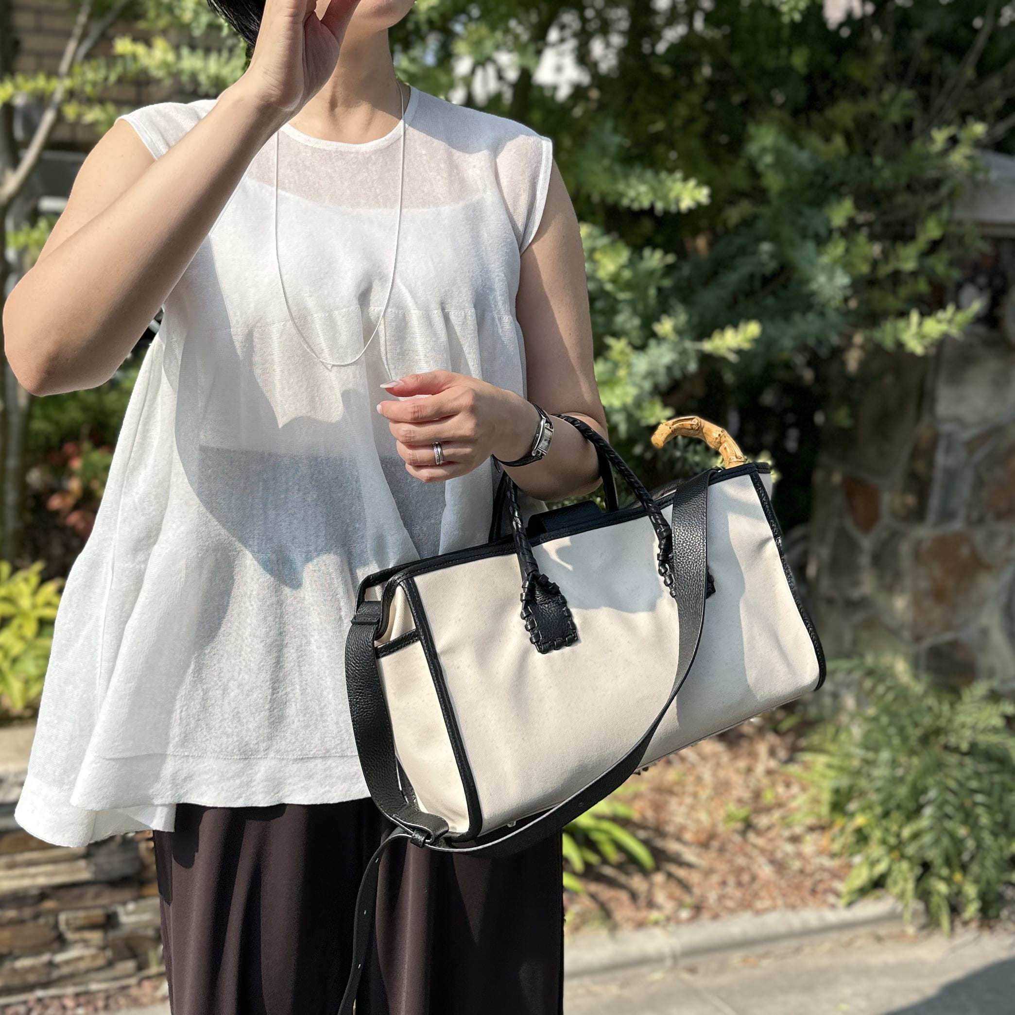 カラーはもう一色/ネイビーもあり、どちらにするか正直めちゃくちゃ悩みました。キレイめに使うならきっとネイビー、でも最初に良いなと思ったのはアイボリーのキャンパス地に黒のパイピング、ハンドル、ショルダーが映える!と思ったこちらの色。結果、自分の直感を信じることにしました!