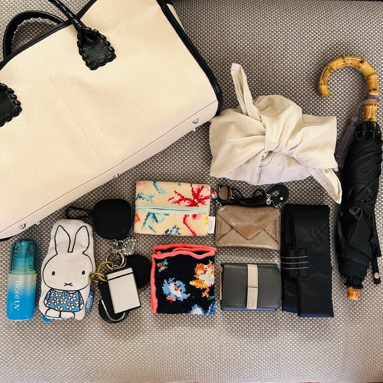 左から、日焼け止め、ポーチ、鍵類、イヤホン、ハンカチ、ティッシュ、お財布、IDカード、エコバッグ、お弁当、日傘