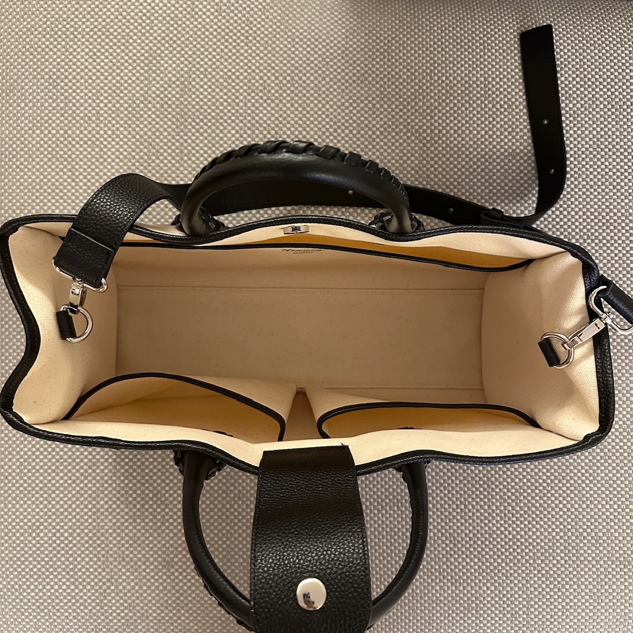 上品に見えるのはおそらく色や形だけでなく、ハンドル、ショルダー、パイピング部にレザーを使用しているから。カジュアルすぎずかっちりもしすぎず、いい感じのデザインと質感です!