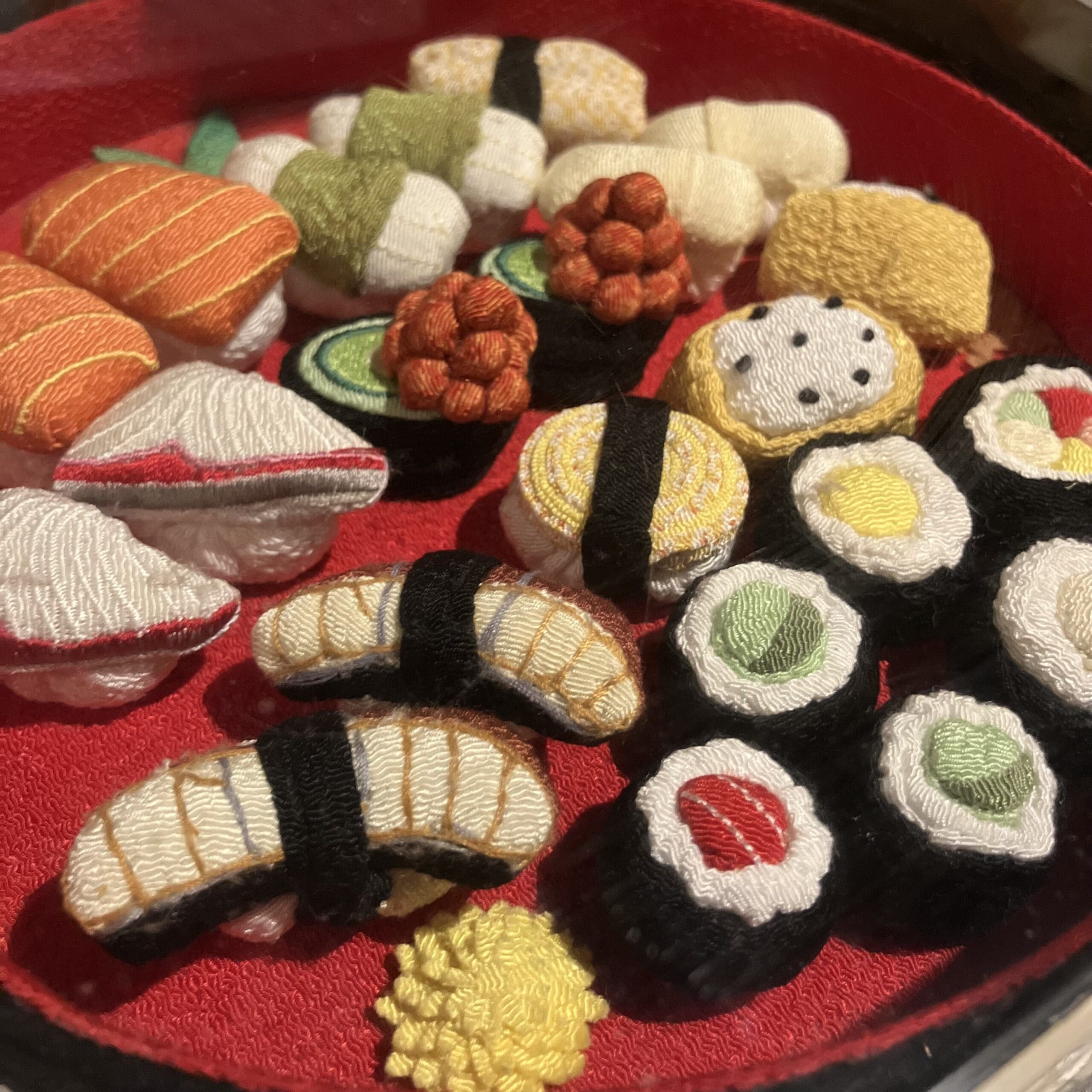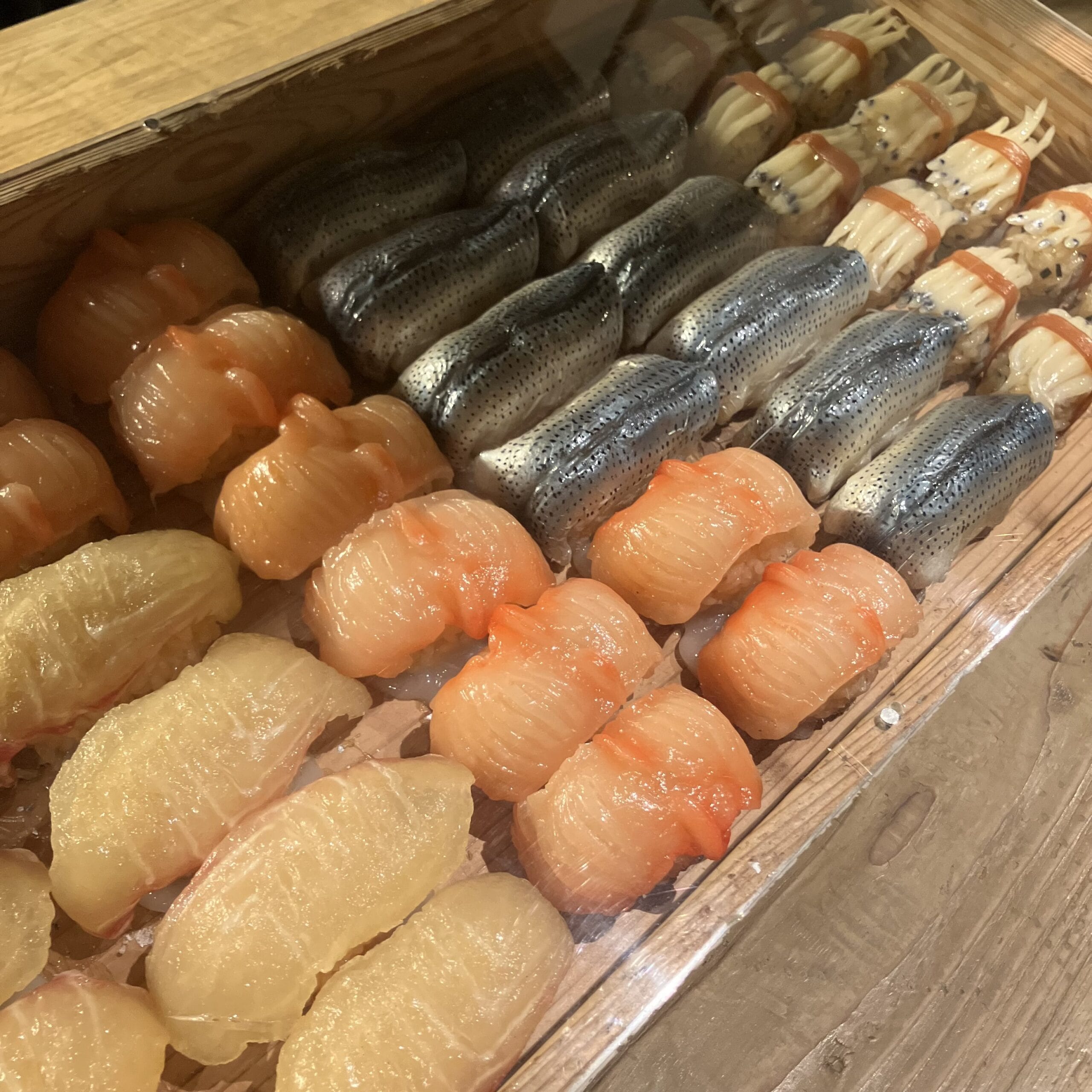2貫、3貫食べたらお腹いっぱいだったそうです。大きさがイマイチ写真だと伝わりませんが、昔の“寿司屋台”に乗ったお寿司たち。