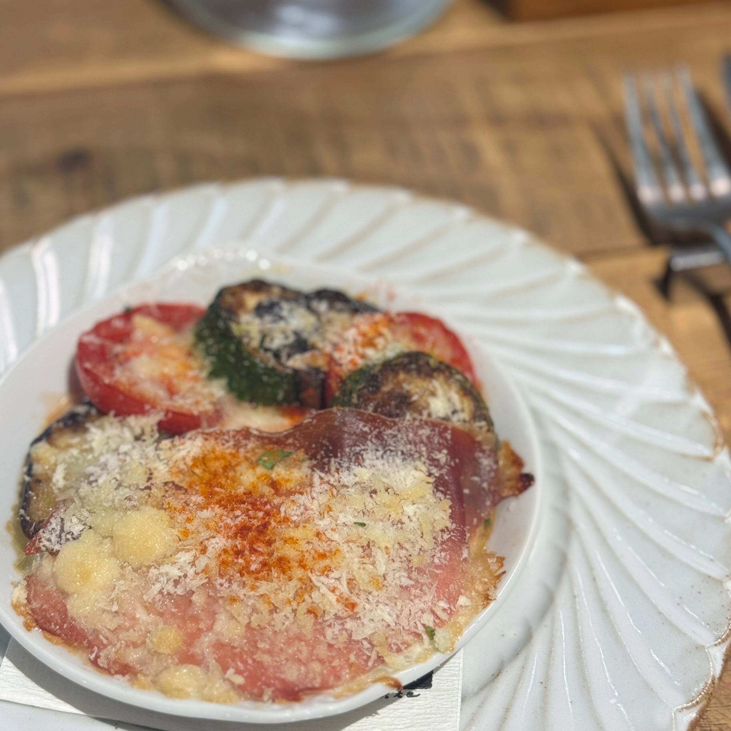 前菜は、茄子・トマト・ズッキーニの重ね焼き。温卵と生ハムもトッピングされていてとっても美味しい♩器もステキだねーって会話をしながらいただきました。
