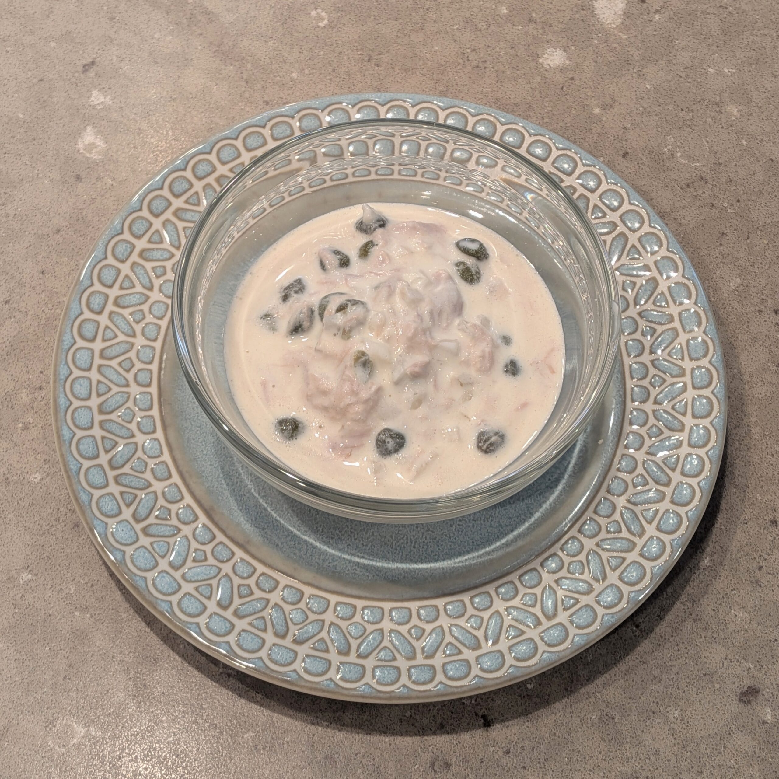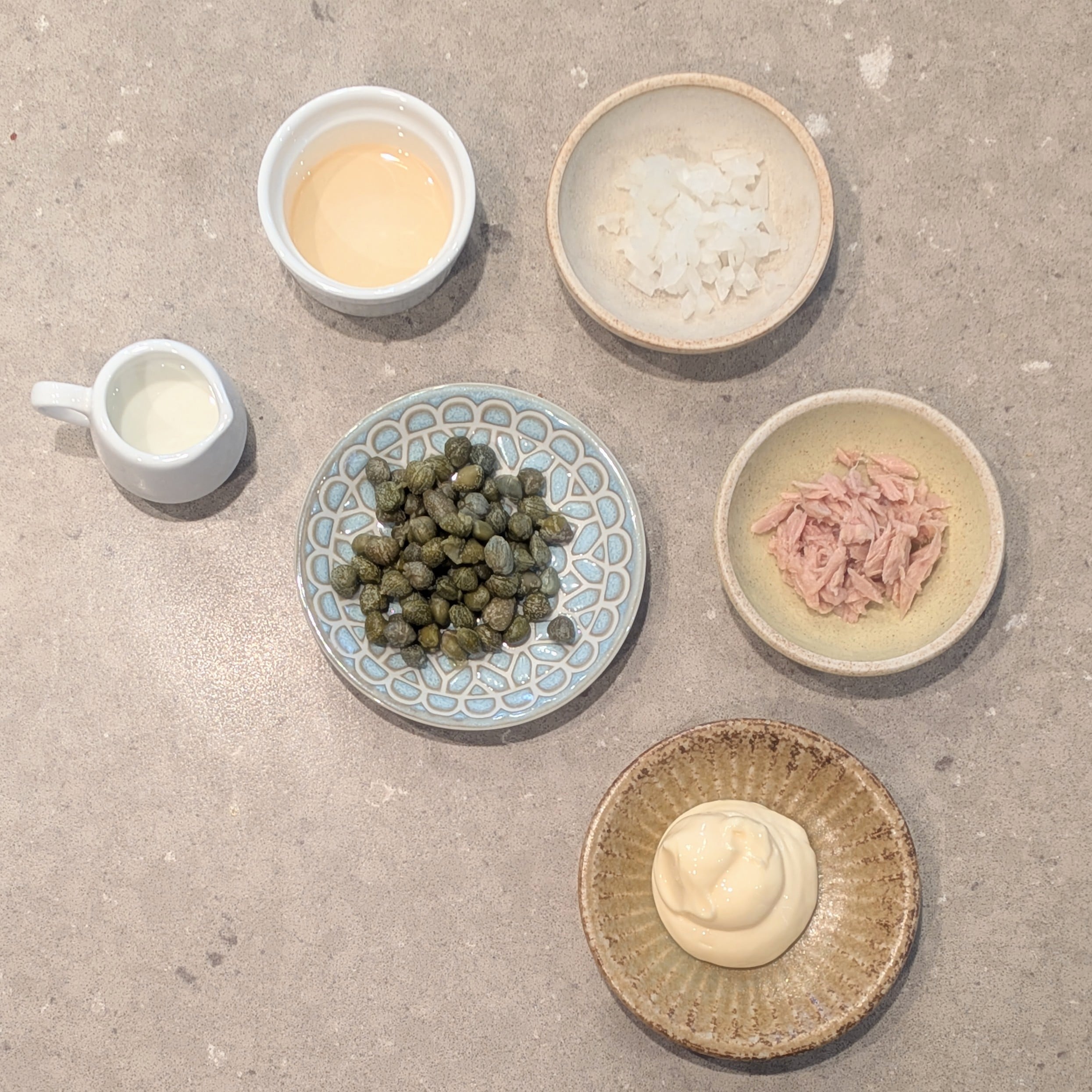 ツナ、マヨネーズ、ケイパーなどの材料を混ぜ合わせるだけで、ソースの完成です!