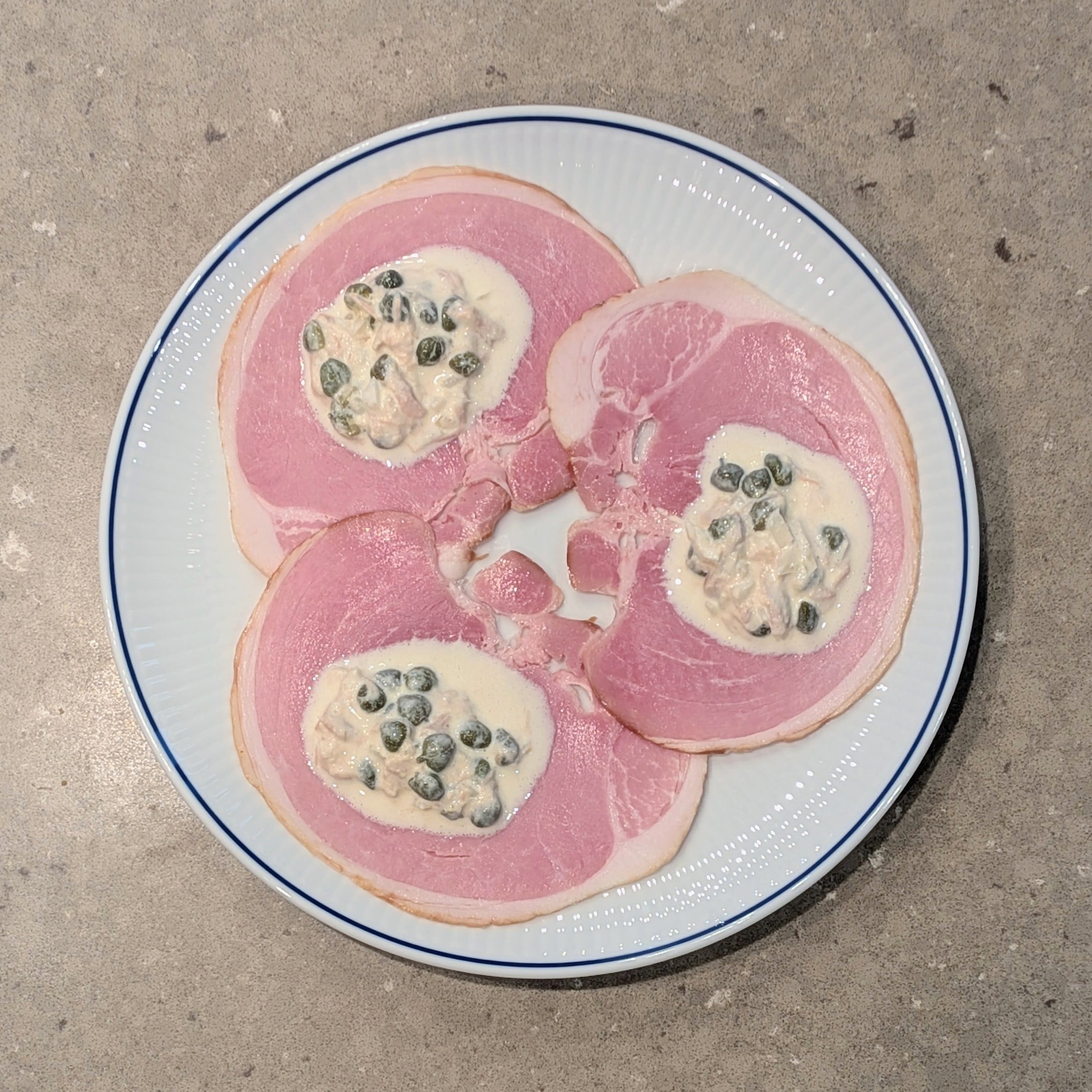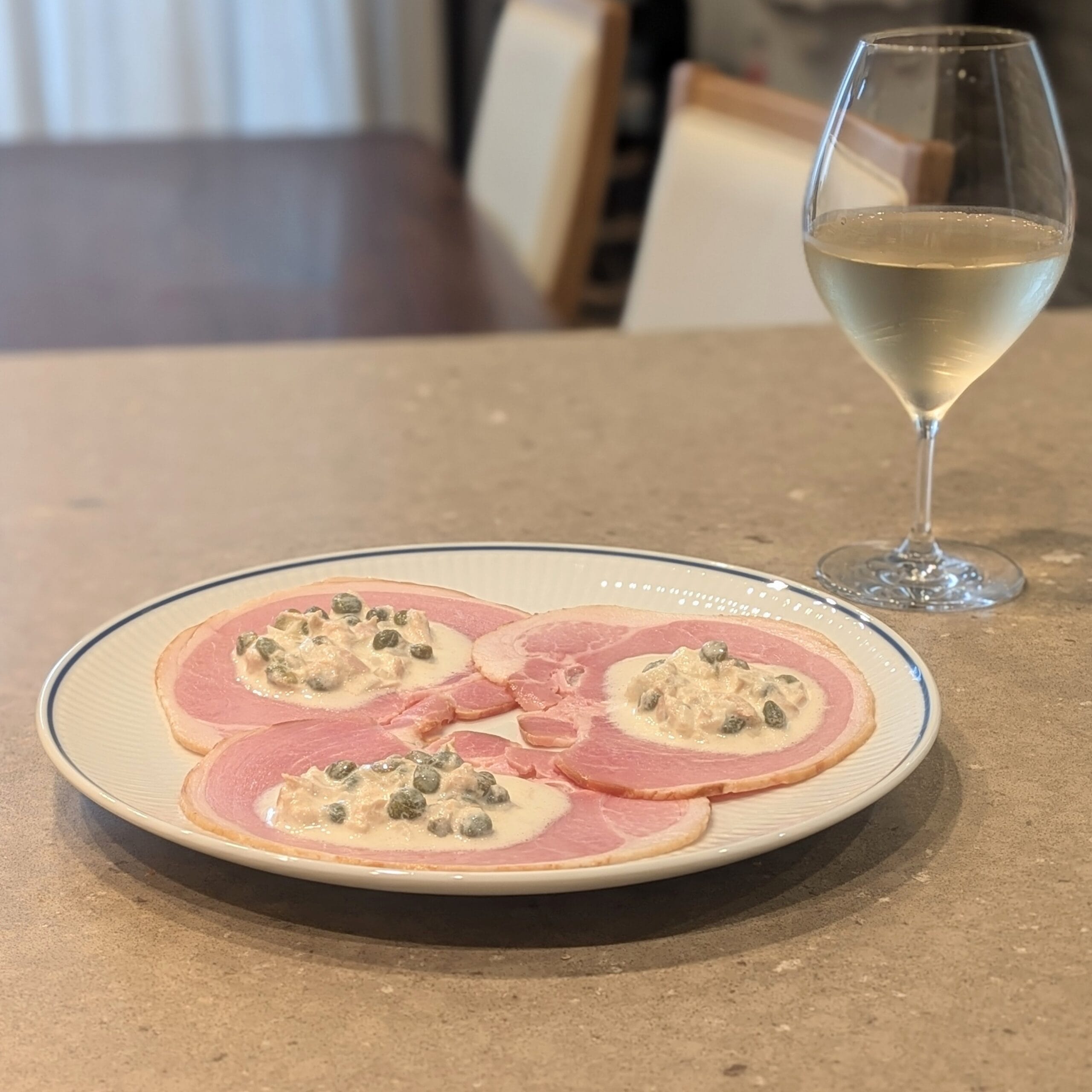そのまま食べてもおいしいももハムを選んだのですが、ソースをかけるとひと味違ったまろやかなおいしさに。まさにおしゃれな味でした。ケイパーやお酢などで強い味になるかと思いきや(塩味や酸味が増すと予想)、ももハムの塩味を和らげ、さわやかさをプラスしてくれる、軽やかなツナマヨソースです。