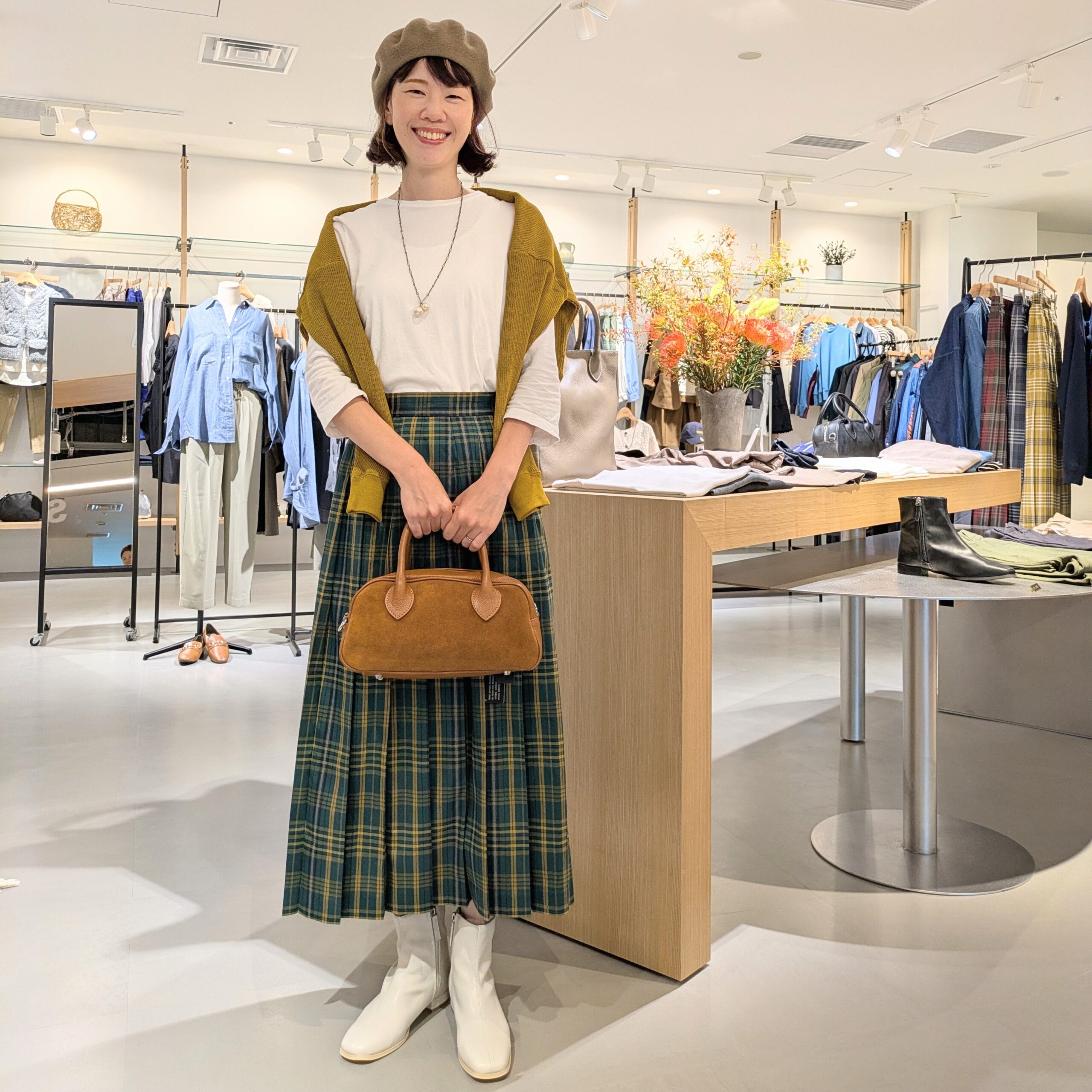 試着させていただきましたー!チェックのイエローを拾って、マスタードイエローのニットを合わせてみました。