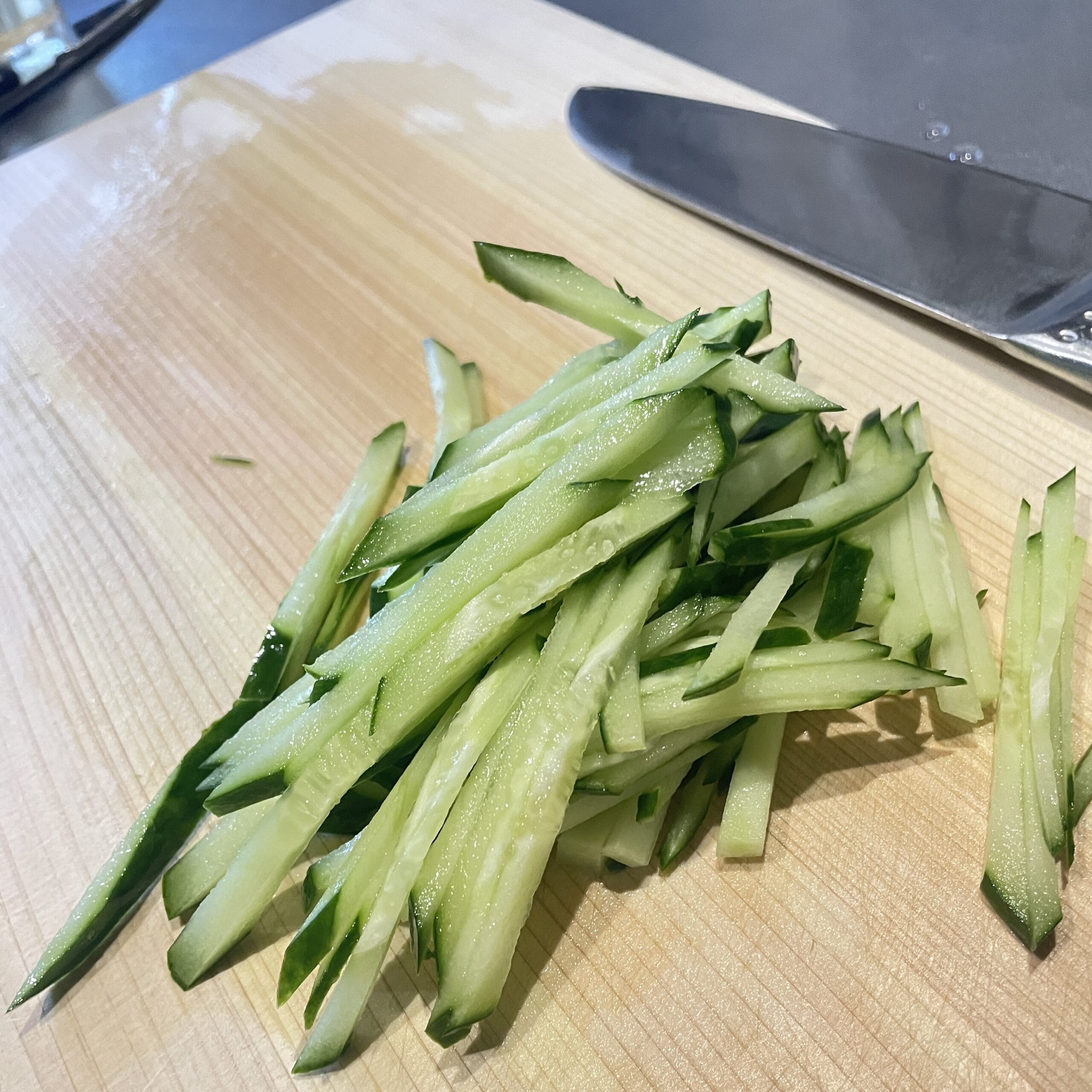 器に麺ときゅうり、キムチを入れて、スープを注げば出来上がり!