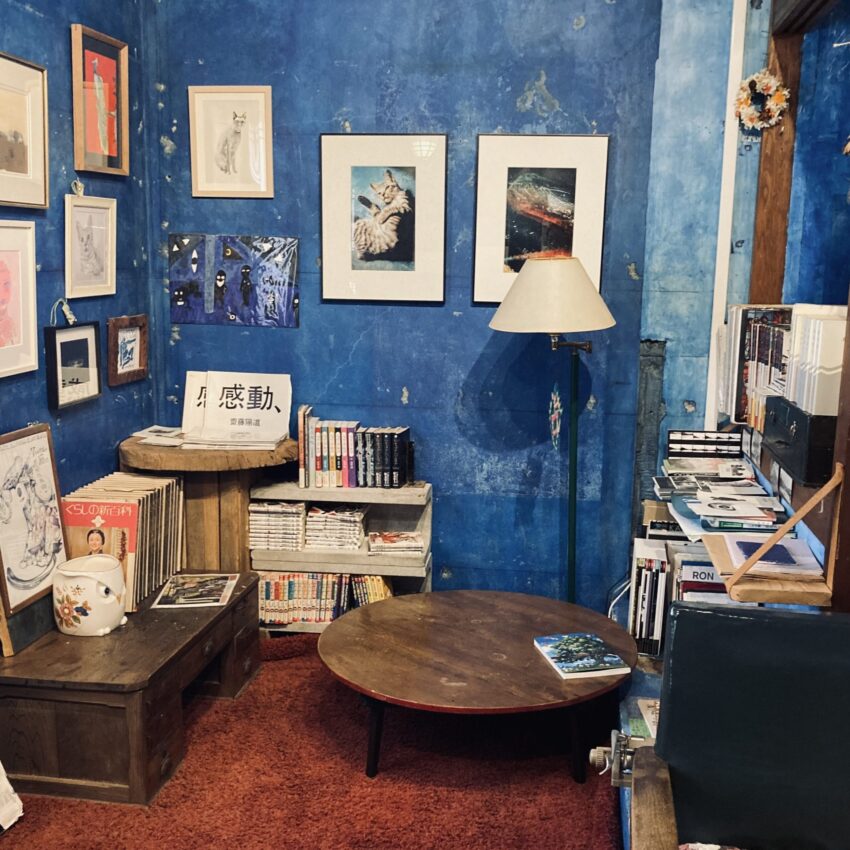 ブルーの壁が印象的な店内には