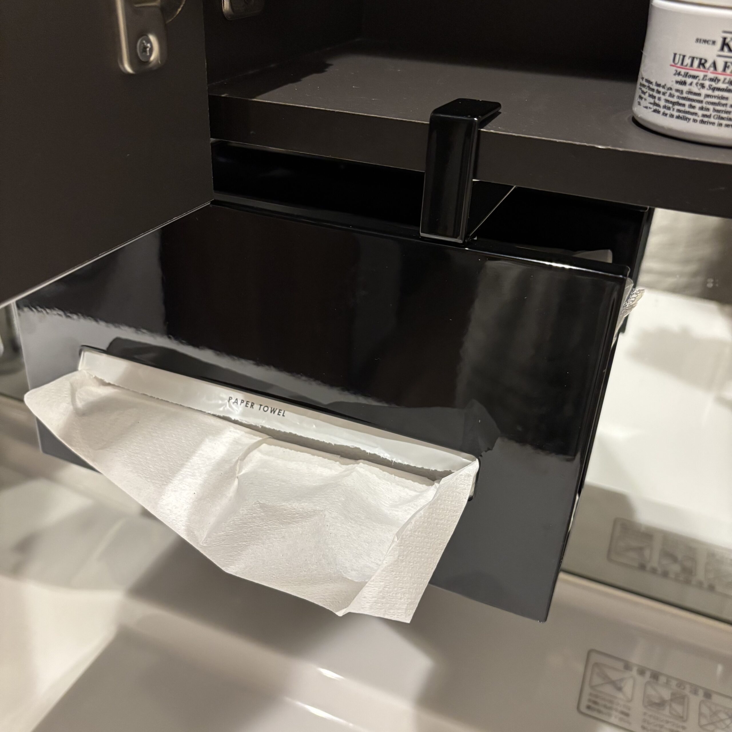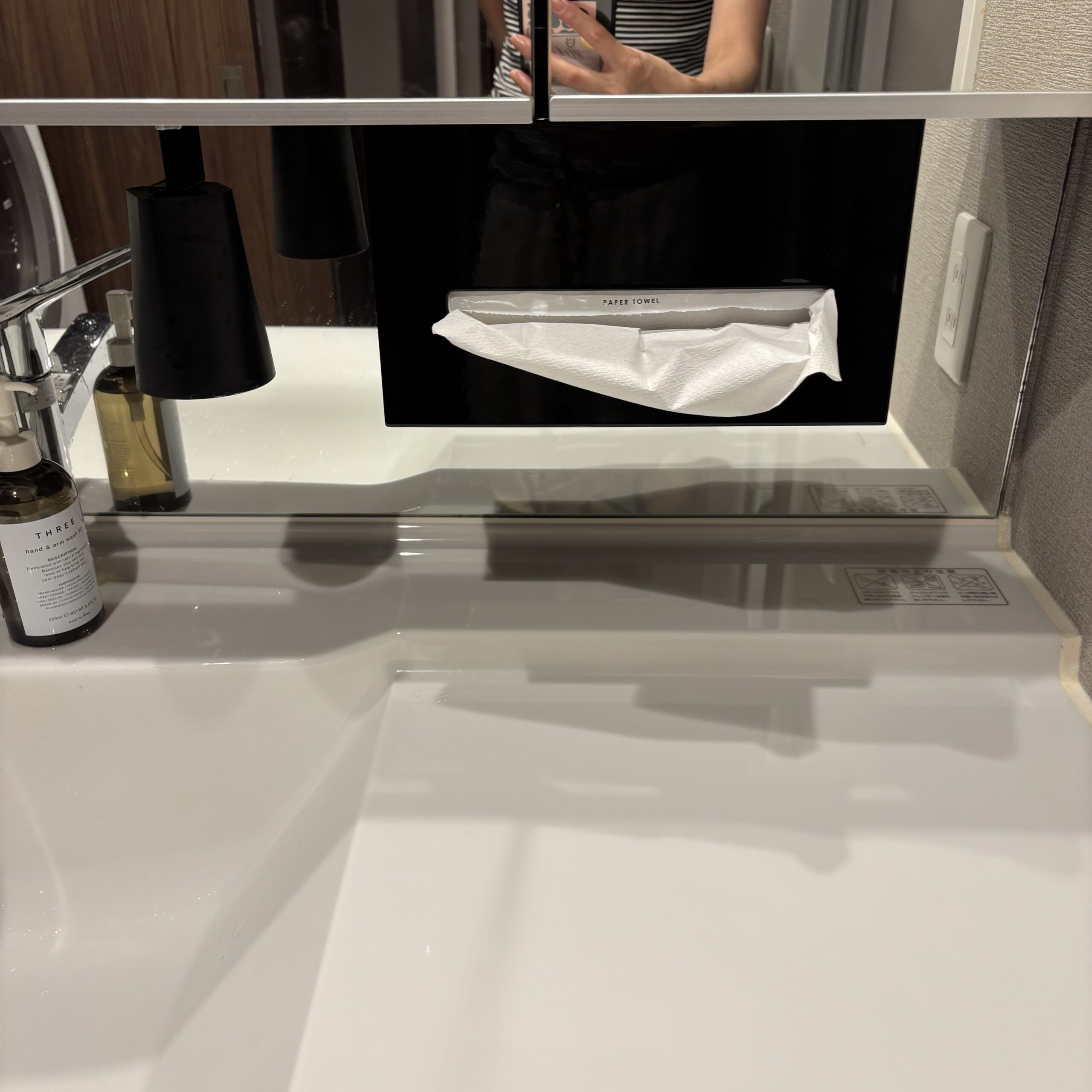 洗面所の戸棚に浮かせて取り付けられるペーパーボックスホルダー