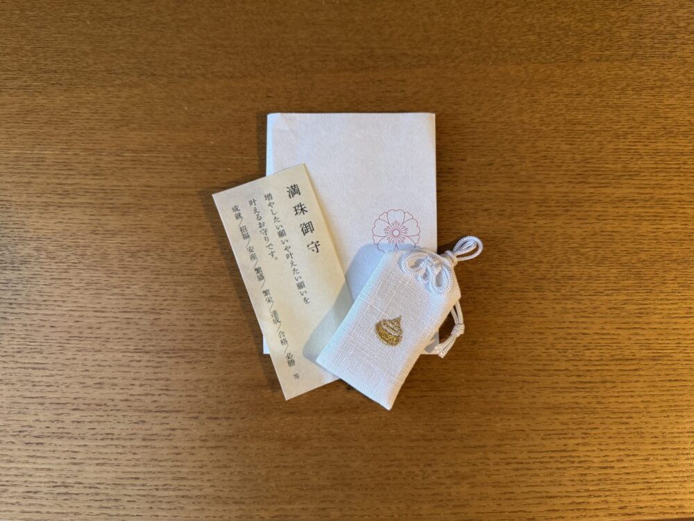 私が受けたのは、増やしたい/叶えたい願いを叶える「満珠御守」。他にも、減らしたい/断ち切りたい願いを叶える「干珠御守」などもありました。