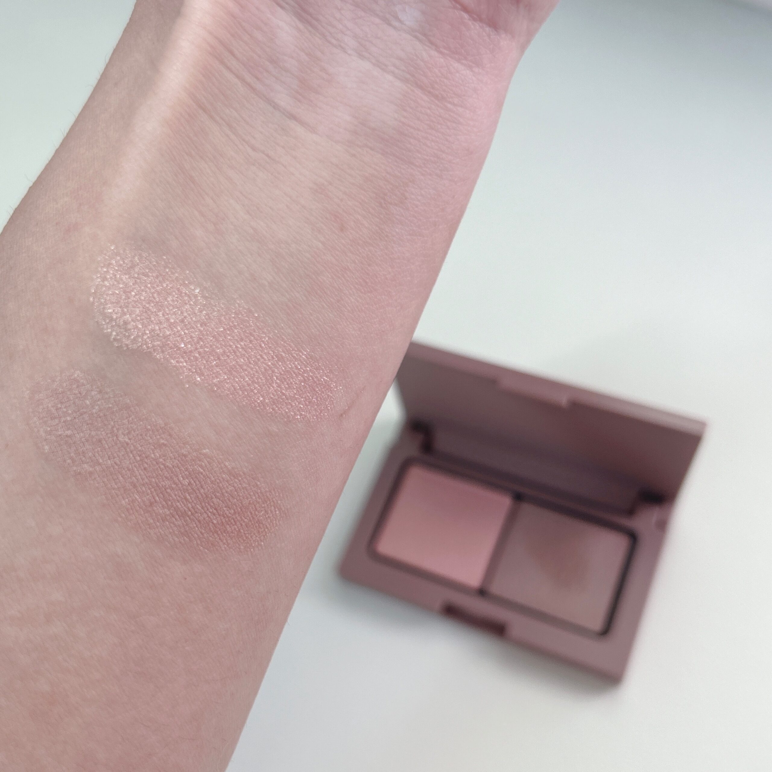 下のブラウンは、あたたかみのあるベージュ寄りのカラーで、目元にのせると立体感が出ます。