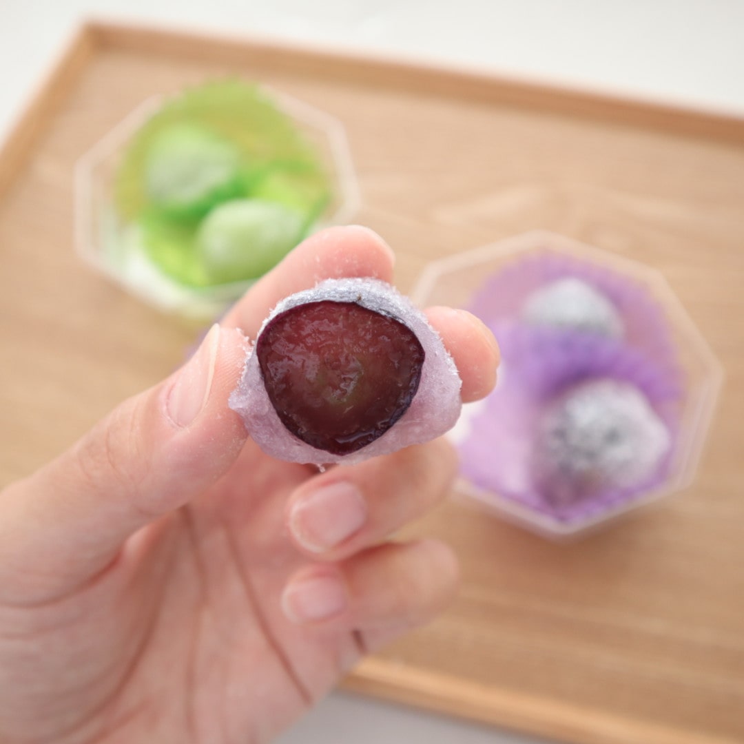 もちっとした求肥に、シャインマスカットとピオーネが入ってるなんて!どんなお味なのかしら…♡