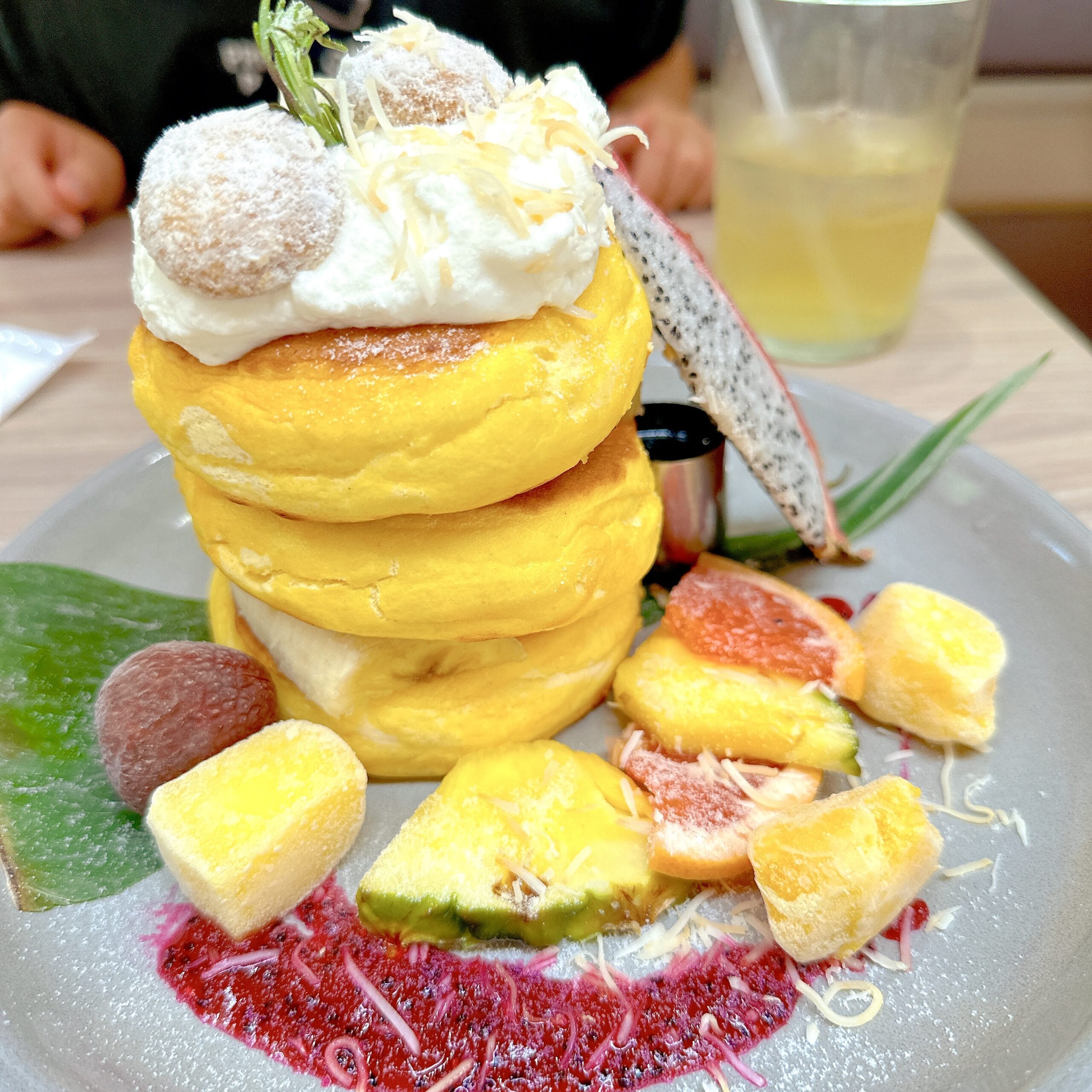 厚めのパンケーキが3枚、そしてその周りにパインやピンクグレープフルーツ、ドラゴンフルーツなど、色とりどりのフルーツが乗っています!