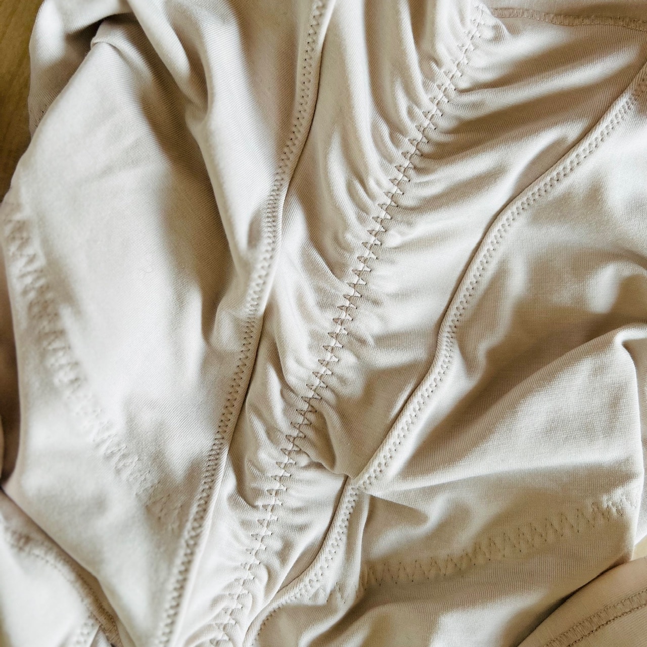 よく見ると、おへそから肛門あたりまで、まっすぐ縫われた張りの強いジグザグの縫製がお尻側を包み込むネットとつながって、骨盤底筋まわりをハンモックのように支えてくれるのがわかります。