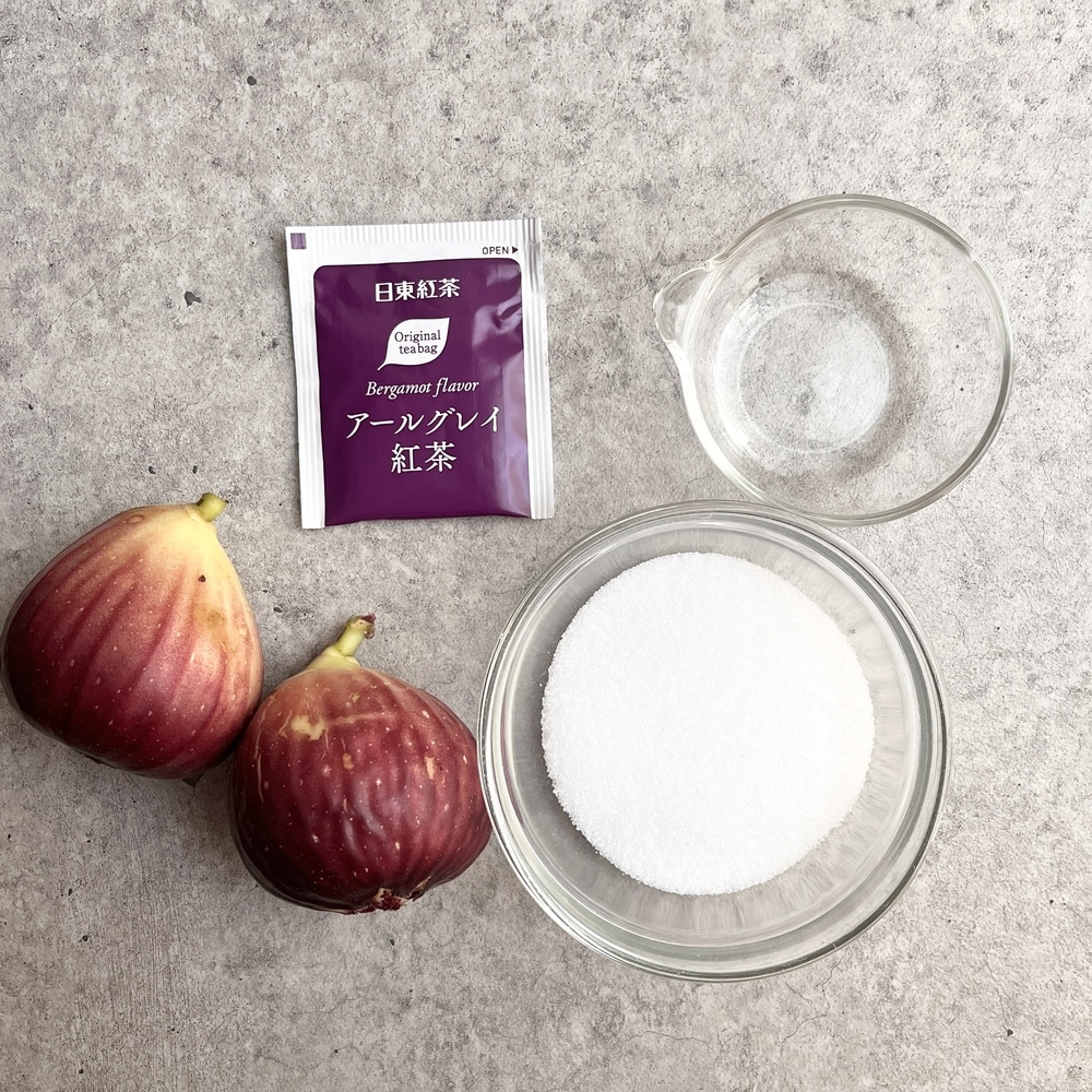 必要なのは、いちじく、グラニュー糖、水、アールグレイの茶葉です。